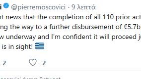 Εξαιρετικά νέα χαρακτήρισε ο Επίτροπος Οικονομικών Υποθέσεων της ΕΕ, Πιερ Μοσκοβισί,την επιβεβαίωσης της ολοκλήρωσης και των 110 προαπαιτούμενων της τρίτης αξιολόγησης, με ανάρτηση στον λογαριασμό του στο twitter, προσθέτοντας ότι ανοίγει ο δρόμος για την εκταμίευση μίας ακόμη δόσης 5,7 δισ. ευρώ.