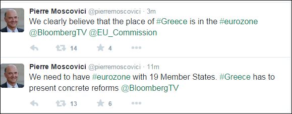 Τις δηλώσεις του Μοσκοβισί tweetάρει στα ελληνικά και η αντιπροσωπεία της Ευρωπαϊκής Επιτροπής στην Ελλάδα.