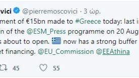 Την τελική εκταμίευση ύψους 15 δισ. ευρώ που πραγματοποιήθηκε σήμερα, χαιρέτισε μέσω Twitter ο επίτροπος Οικονομικών Υποθέσεων, Πιερ Μοσκοβισί.