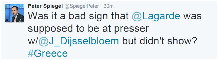 «Ήταν κακό σημάδι ότι η Λαγκάρντ έπρεπε να είναι στη συνέντευξη Τύπου με τον Γερούν Ντάισελμπλουμ, αλλά δεν εμφανίστηκε;», έγραψε ο Peter Spiegel.