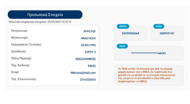4) Επιλέγοντας το «Προφίλ» μπορεί να ενημερωθεί για τα προσωπικά του στοιχεία που έχει δηλωμένα και στον ΕΦΚΑ, καθώς και για το ΑΦΜ, ΑΜΚΑ και ΙΒΑΝ.