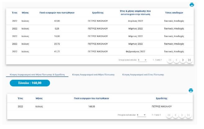 Ενημερώνεται σχετικά με τα σύνολα των «Εισφορών που έχουν εξοφληθεί», των «Εισφορών που Οφείλονται», των «Εισφορών του Ασφαλισμένου», των «Εισφορών του Εργοδότη», των «Συνολικών Εισφορών» και των «Ημερών Ασφάλισης». Στον πίνακα ακριβώς από κάτω βλέπει την ανάλυση των εισφορών του. Η κάθε εγγραφή του πίνακα δείχνει την εισφορά του ασφαλισμένου για κάθε περίοδο ασφάλισης ανά εργοδότη. Τα αποτελέσματα του πίνακα επηρεάζονται από την αναζήτηση που εκτελεί ο ασφαλισμένος αναλόγως των παραμέτρων που εισάγει στα φίλτρα. Ακριβώς επάνω από τον πίνακα εμφανίζονται πάντοτε τα