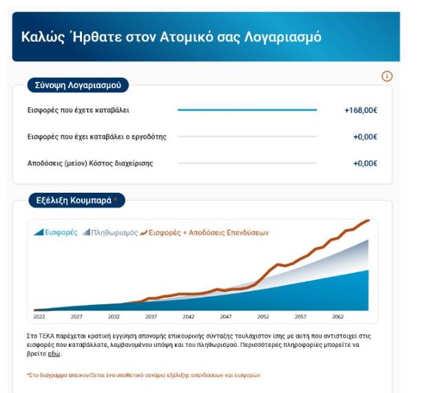 Σημειώνεται πως στο συγκεκριμένο διάγραμμα απεικονίζεται ένα υποθετικό σενάριο εξέλιξης επενδύσεων και εισφορών. Επιπλέον, στα δεξιά της αρχικής σελίδας εμφανίζεται το σύνολο των αποταμιεύσεων που βρίσκονται στον κουμπαρά του ασφαλισμένου, ενώ ενημερώνεται και για το αν υπάρχουν τυχόν ανεξόφλητες εισφορές. Τέλος, παρέχονται χρήσιμες πληροφορίες στον χρήστη σχετικά με την σύνταξή του.