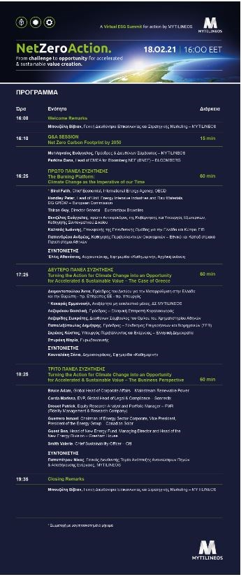 Την ίδια ημέρα η MYTILINEOS θα παρουσιάσει τους στόχους και δεσμεύσεις της για την μείωση του ανθρακικού της αποτυπώματος τα επόμενα χρόνια, καθώς έχοντας ασπαστεί τις βασικές Περιβαλλοντικές και Κοινωνικές Αρχές, και τις Αρχές Διακυβέρνησης (ESG), έχει ενσωματώσει πλήρως τα κριτήρια αυτά στον τρόπο που δρα και λειτουργεί σε όλο το φάσμα δραστηριοτήτων της. Η έναρξη του Συνεδρίου θα πραγματοποιηθεί με την συζήτηση του Προέδρου και Διευθύνοντος Συμβούλου της MYTILINEOS, Ευάγγελου Μυτιληναίου με την Dana Perking, επικεφαλής Bloomberg EMEA με θέμα: «Net Zero Carbon Footprint by 2050».