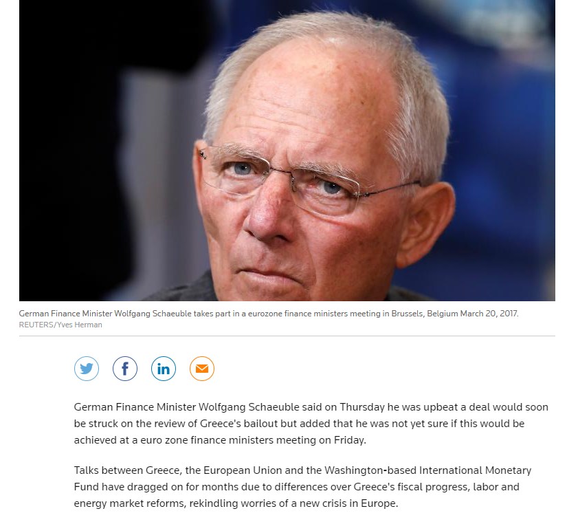 Την εκτίμηση ότι μπορεί να επιτευχθεί σύντομα συμφωνία για την ελληνική αξιολόγηση, εξέφρασε ο Γερμανός υπουργός Οικονομικών, Βόλφγκανγκ Σόιμπλε, σύμφωνα με το πρακτορείο ειδήσεων Reuters.Ωστόσο ο Γερμανός υπουργός Οικονομικών διευκρίνισε ότι δεν είναι ακόμα σίγουρος “εάν αυτή η συμφωνία θα επιτευχθεί στην αυριανή συνάντηση των υπουργών Οικονομικών της Ευρωζώνης”.