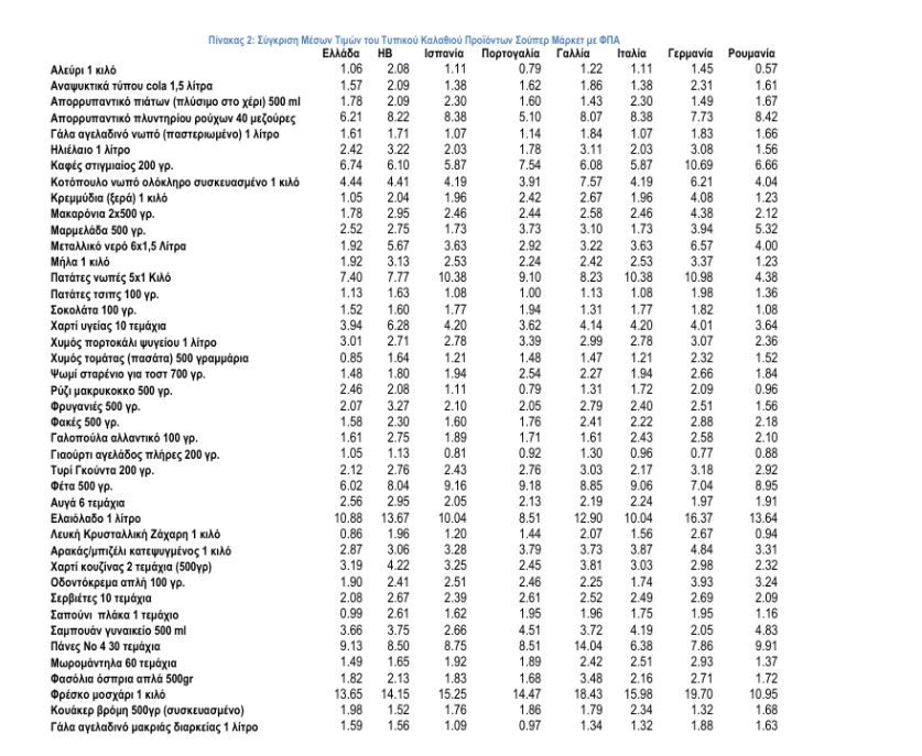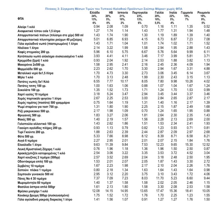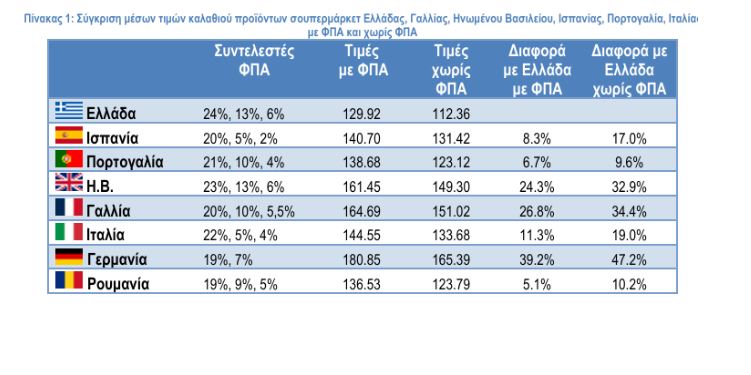 Η εικόνα των αποτελεσμάτων αλλάζει σημαντικά όταν αφαιρέσουμε τον αναλογούντα ΦΠΑ ανά χώρα για να γίνουν αντιληπτές οι πραγματικές τιμές των προϊόντων σούπερ μάρκετ. Η σύγκριση των καλαθιών σε αυτή την περίπτωση (σχήμα 1 και πίνακας 1) δείχνει ότι οι και οι επτά χώρες έχουν πιο ακριβό μέσο καλάθι από την Ελλάδα, η Γερμανία κατά 47%, η Γαλλία κατά 34%, το Ηνωμένο Βασίλειο κατά 32%, η Ιταλία κατά 19%, η Ισπανία κατά 17% η Πορτογαλία κατά 10% και η Ρουμανία κατά 10%. Αυτό είναι αποτέλεσμα της διαφοράς που έχει ο χαμηλός ΦΠΑ ανά χώρα (πρόκειται για τον ΦΠΑ που αναφέρεται σε τρόφιμα και ποτά).