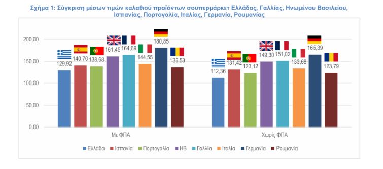Η σύγκριση των μέσων τιμών των καλαθιών (πίνακας 1) δείχνει ότι και οι τέσσερις χώρες έχουν σημαντικά ακριβότερο μέσο καλάθι από την Ελλάδα, 39% η Γερμανία, 27% η Γαλλία, 24% το Ηνωμένο Βασίλειο, 11% η Ιταλία, ενώ ακριβότερο κατά 7% η Πορτογαλία, 8% η Ισπανία και 5% η Ρουμανία.