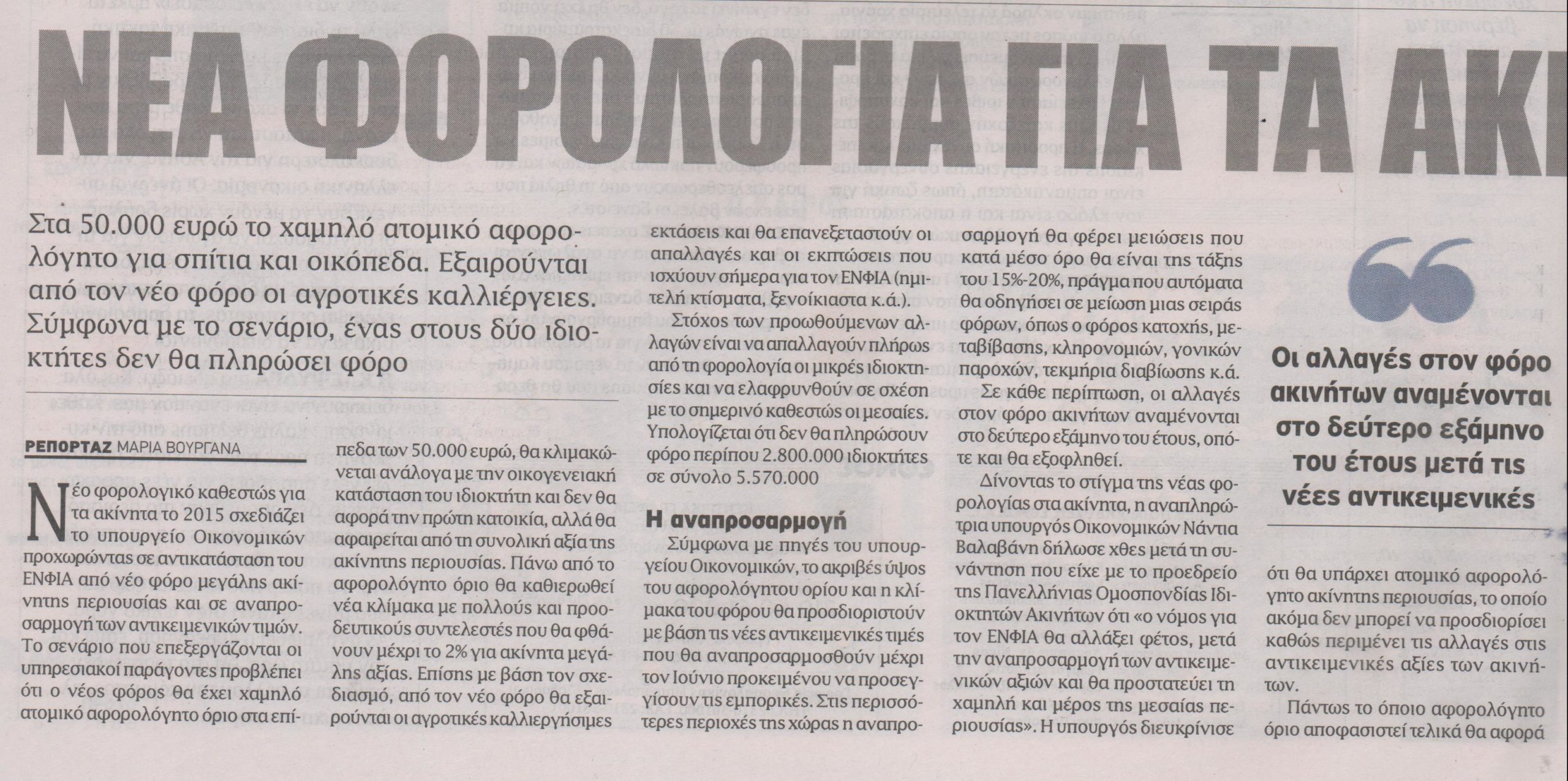 Νέο φορολογικό καθεστώς για τα ακίνητα το 2015 σχεδιάζει το υπουργείο Οικονομικών προχωρώντας σε αντικατάσταση του ΕΝΦΙΑ από νέο φόρο μεγάλης ακίνητης περιουσίας και σε αναπροσαρμογή των αντικειμενικών τιμών.