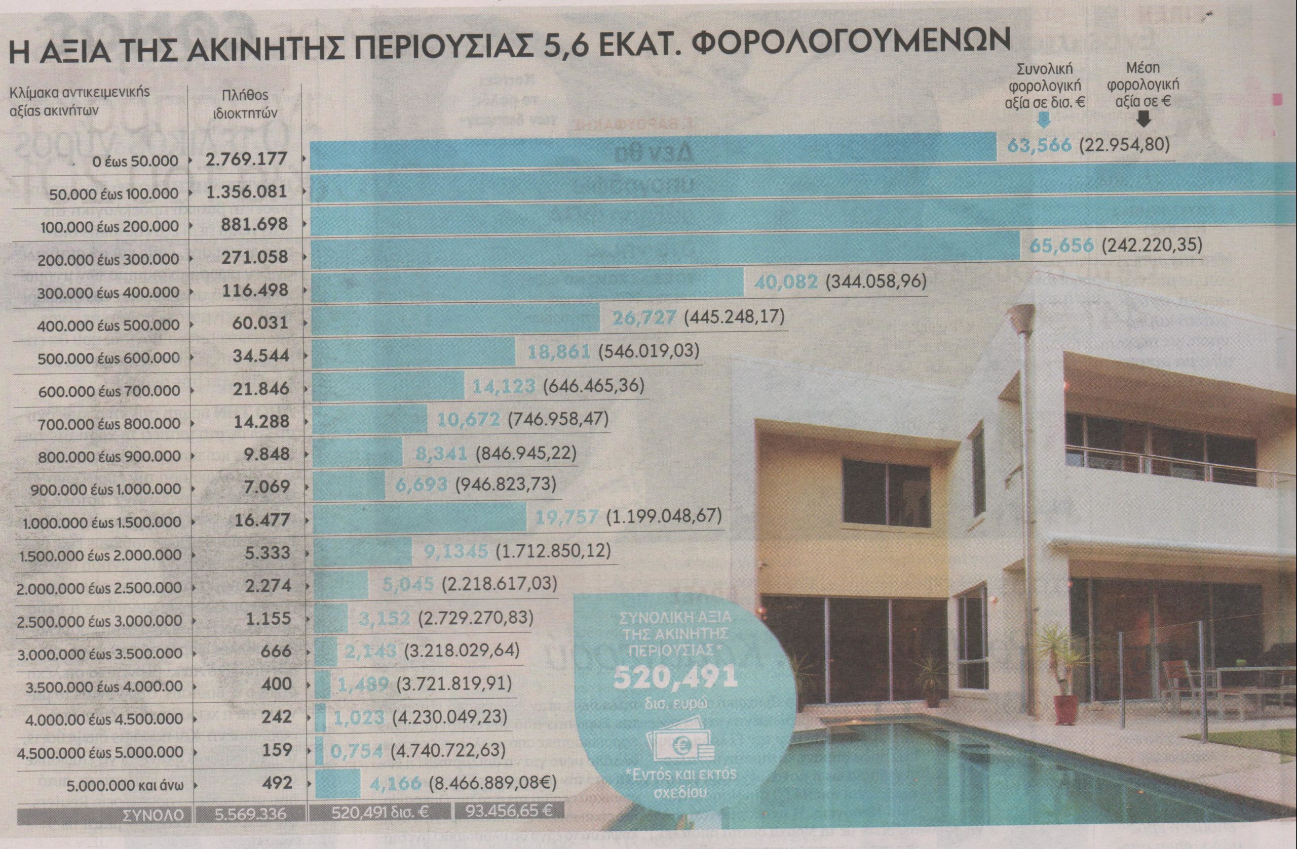 Το σενάριο που επεξεργάζονται οι υπηρεσιακοί παράγοντες προβλέπει ότι ο νέος φόρος θα έχει χαμηλό ατομικό αφορολόγητο όριο στα επίπεδα των 50.000 ευρώ, θα κλιμακώνεται ανάλογα με την οικογενειακή κατάσταση του ιδιοκτήτη και δεν θα αφορά την πρώτη κατοικία, αλλά θα αφαιρείται από τη συνολική αξία της ακίνητης περιουσίας. Πάνω από το αφορολόγητο όριο θα καθιερωθεί νέα κλίμακα με πολλούς και προοδευτικούς συντελεστές που θα φθάνουν μέχρι το 2% για ακίνητα μεγάλης αξίας.