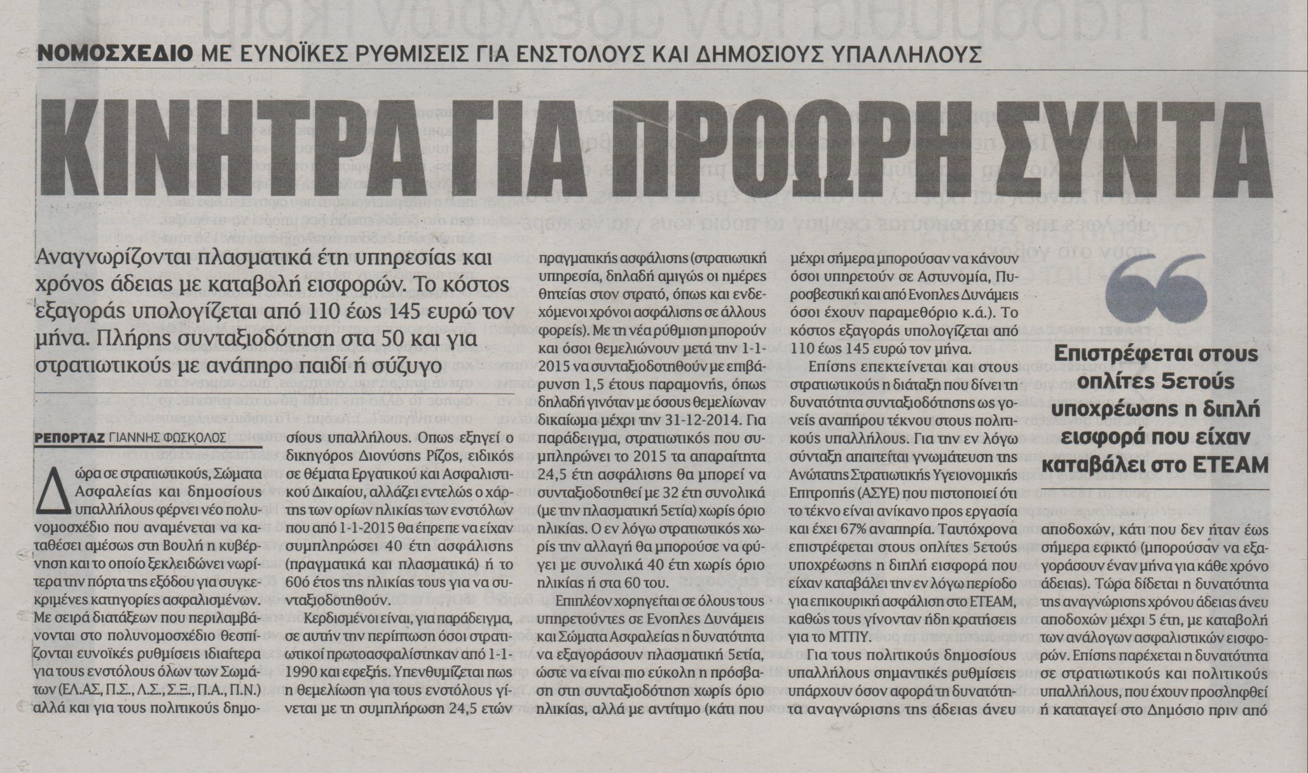 Για παράδειγμα, στρατιωτικός που συμπληρώνει το 2015 τα απαραίτητα 24,5 έτη ασφάλισης θα μπορεί να συνταξιοδοτηθεί με 32 έτη συνολικά (με την πλασματική 5ετία) χωρίς όριο ηλικίας. Ο εν λόγω στρατιωτικός χωρίς την αλλαγή θα μπορούσε να φύγει με συνολικά 40 έτη χωρίς όριο ηλικίας ή στα 60 του.