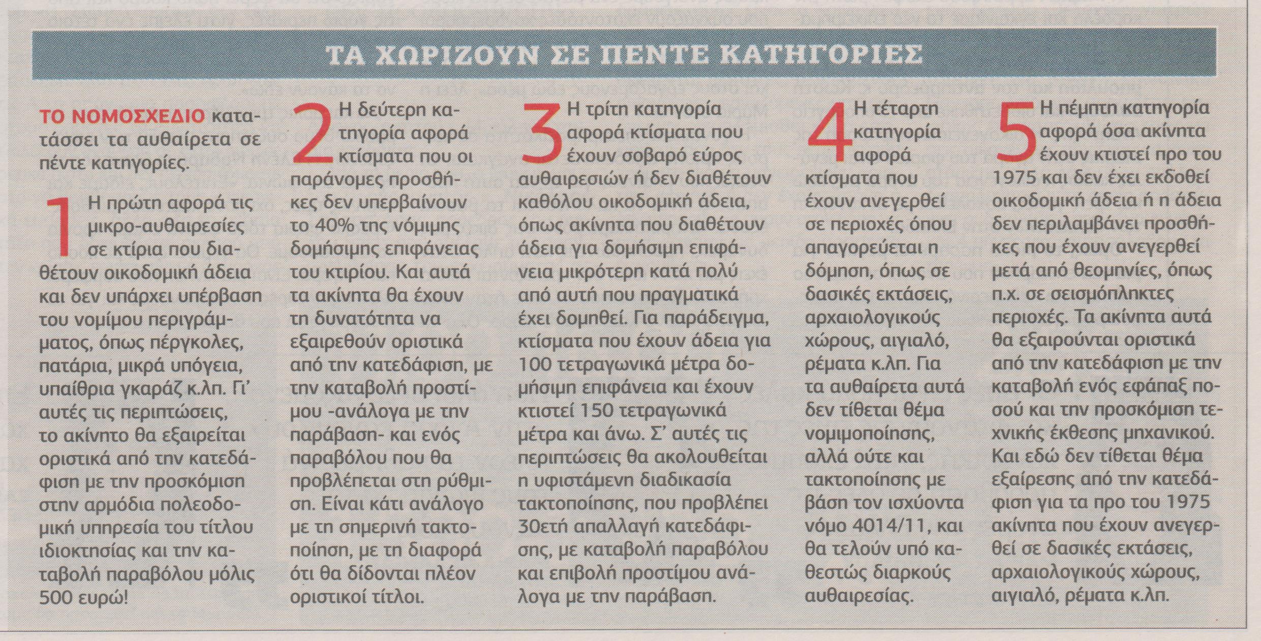 Στο νέο νόμο, προβλέπονται διαδικασίες νομιμοποίησης που δεν θα ταλαιπωρούν τους πολίτες, αλλά θα δίνουν οριστική λύση στο πρόβλημα των αυθαιρεσιών, με την πληρωμή ακόμη και ενός απλού παραβόλου των 500 ευρώ. Παράλληλα, όλα τα κτίσματα που έχουν ανεγερθεί πριν από το 1975 θα θεωρούνται νόμιμα, είτε διαθέτουν άδεια είτε όχι.