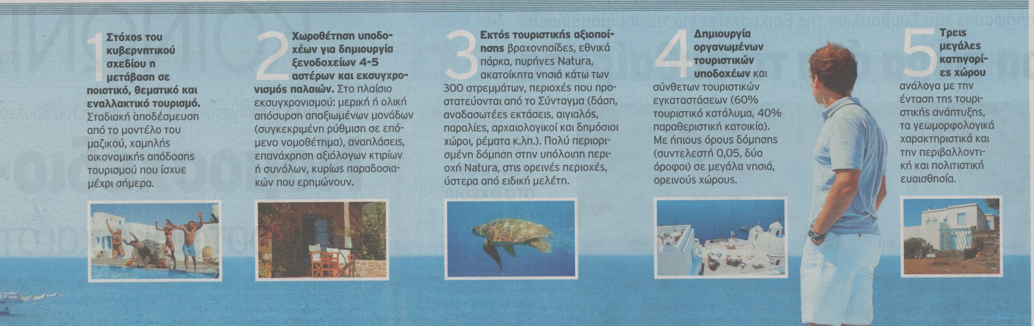 Στόχος είναι η Ελλάδα να εγκαταλείψει το σημερινό μοντέλο του μαζικού και τελικά χαμηλής οικονομικής απόδοσης τουρισμού και να στραφεί στην ποιότητα, αξιοποιώντας τους τεράστιους φυσικούς και πολιτιστικούς της πόρους.
