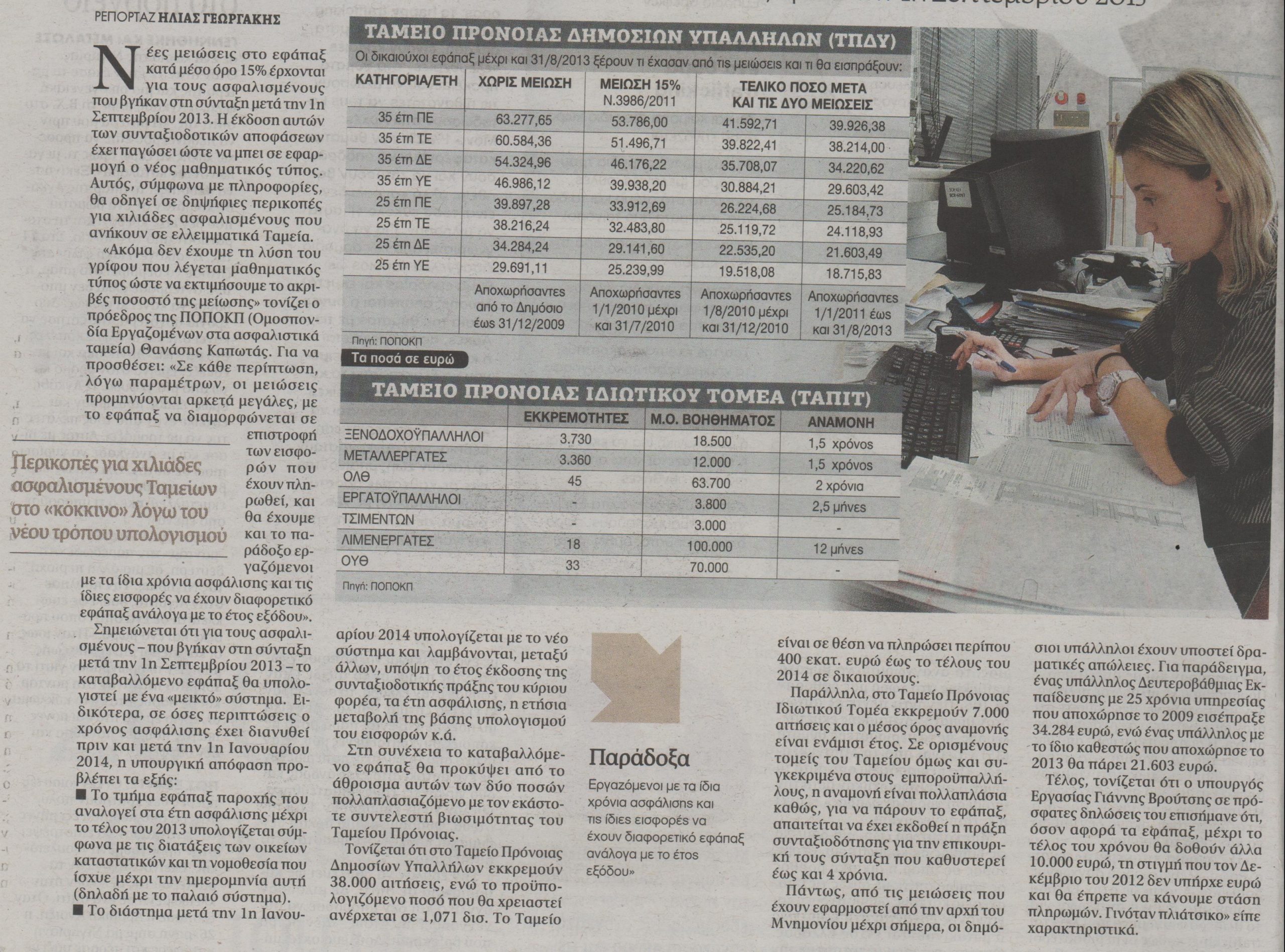 «Ακόμα δεν έχουμε τη λύση του γρίφου που λέγεται μαθηματικός τύπος ώστε να εκτιμήσουμε το ακριβές ποσό της μείωσης» τονίζει ο Πρόεδρος της ΠΟΠΟΚΠ (Ομοσπονδία Εργαζομένων στα ασφαλιστικά ταμεία) Θανάσης Καπωτάς. Για να προσθέσει: «Σε κάθε περίπτωση, λόγω παραμέτρων, οι μειώσεις προμηνύονται αρκετά μεγάλες, με το εφάπαξ να διαμορφώνεται σε επιστροφή των εισφορών που έχουν πληρωθεί, και θα έχουμε και το παράδοξο, εργαζόμενοι με τα ίδια χρόνια ασφάλισης και τις ίδιες εισφορές να έχουν διαφορετικό εφάπαξ ανάλογα με το έτος εξόδου».