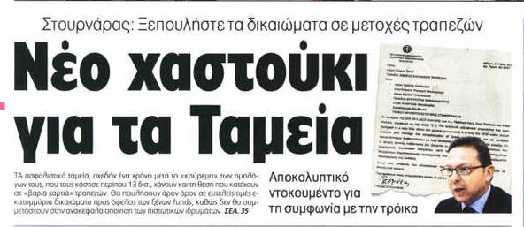 Σύμφωνα με την Ελευθεροτυπία, που επικαλείται σχετικό έγγραφο-ντοκουμέντο του Γιάννη Στουρνάρα προς την τρόικα, τα Ταμεία θα αναγκαστούν να πουλήσουν όσο-όσο εκατομμύρια δικαιώματα προς όφελος των ξένων funds, καθώς δεν θα συμμετάσχουν στην ανακεφαλαιοποίηση των τραπεζών.
