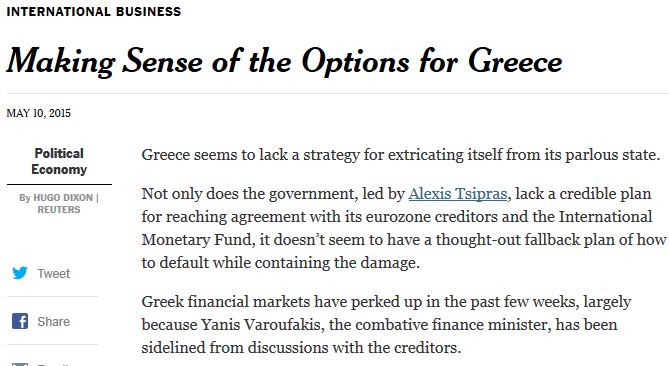 Για απουσία σχεδίου συμφωνίας με τους εταίρους ή χρεοκοπίας με το μικρότερο κόστος, κατηγορεί την κυβέρνηση του Αλέξη Τσίπρα, ο Ούγκο Ντίξον στη στήλη του στους New York Times, σε ένα ακόμα σχόλιο πίεσης της ελληνικής πλευράς από διεθνή ΜΜΕ ενόψη του Eurogroup.