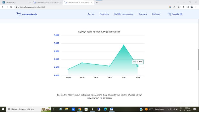 Αυτό τουλάχιστον φαίνεται σε διαγράμματα της ίδιας της πλατφόρμας https://e-katanalotis.gov.gr για το πώς διαμορφώθηκε η μέση τιμή προϊόντων την τελευταία εβδομάδα.