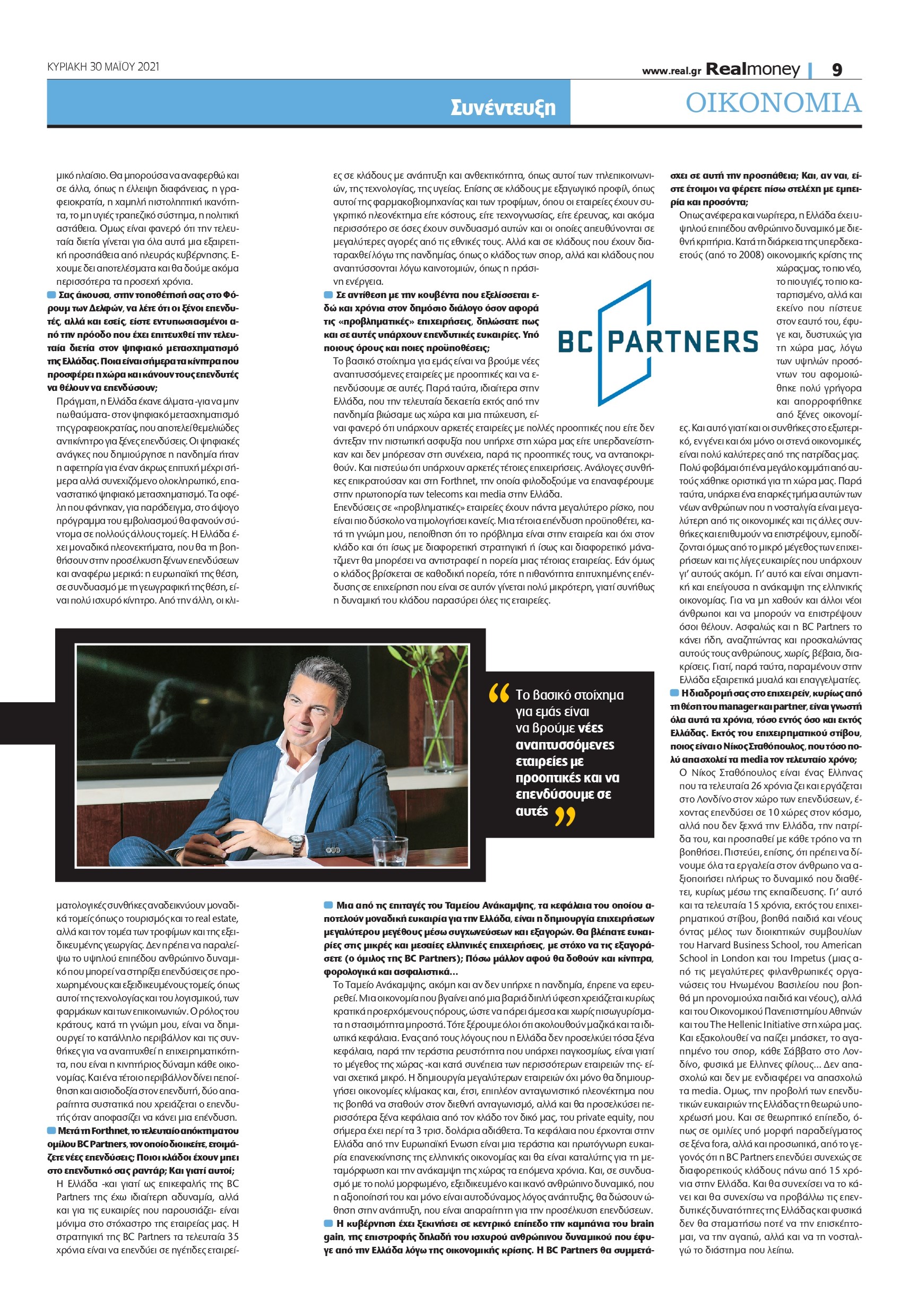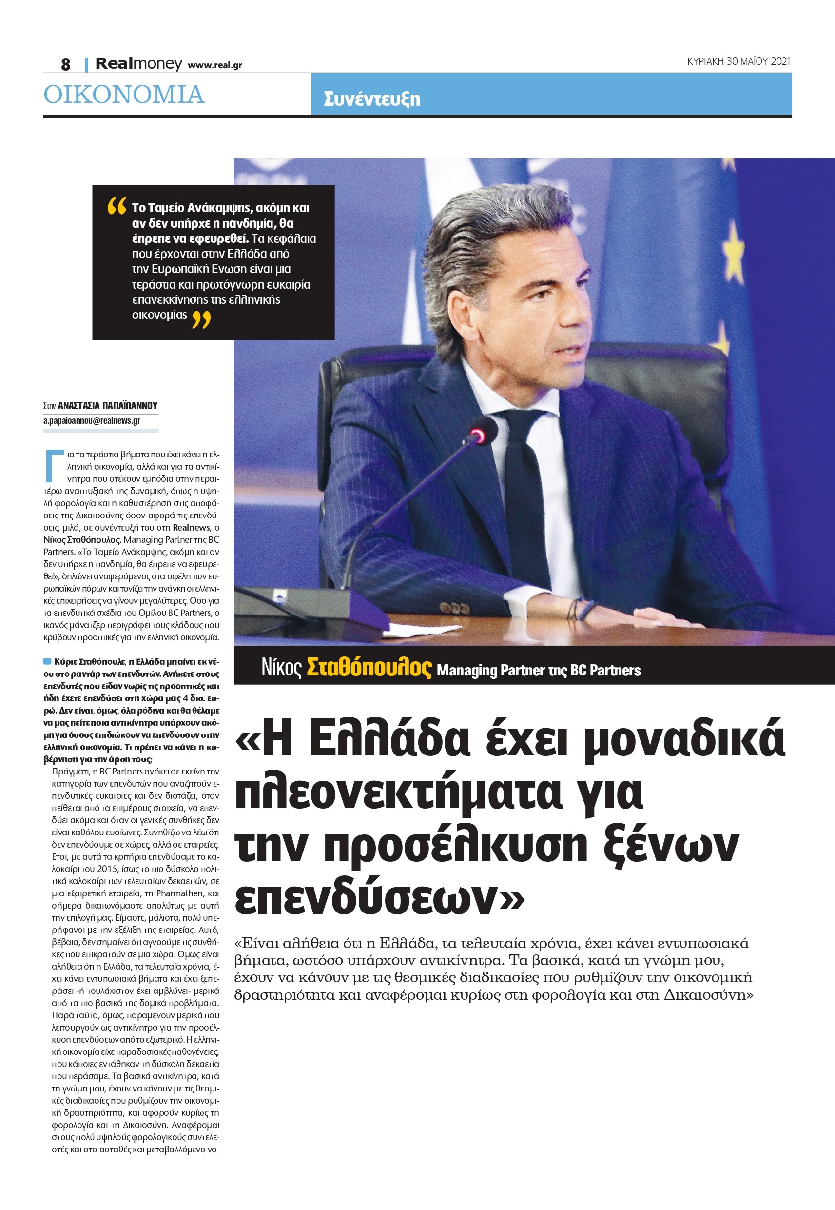 Για τα τεράστια βήματα που έχει κάνει η ελληνική οικονομία, αλλά και για τα αντικίνητρα που στέκουν εμπόδια στην περαιτέρω αναπτυξιακή της δυναμική, όπως η υψηλή φορολογία και η καθυστέρηση στις αποφάσεις της Δικαιοσύνης όσον αφορά τις επενδύσεις, μιλά, σε συνέντευξή του στη Realnews, ο Νίκος Σταθόπουλος, Managing Partner της BC Partners. «Το Ταμείο Ανάκαμψης, ακόμη και αν δεν υπήρχε η πανδημία, θα έπρεπε να εφευρεθεί», δηλώνει αναφερόμενος στα οφέλη των ευρωπαϊκών πόρων και τονίζει την ανάγκη οι ελληνικές επιχειρήσεις να γίνουν μεγαλύτερες. Όσο για τα επενδυτικά σχέδια του Ομίλου BC Partners, ο ικανός μάνατζερ περιγράφει τους κλάδους που κρύβουν προοπτικές για την ελληνική οικονομία.
