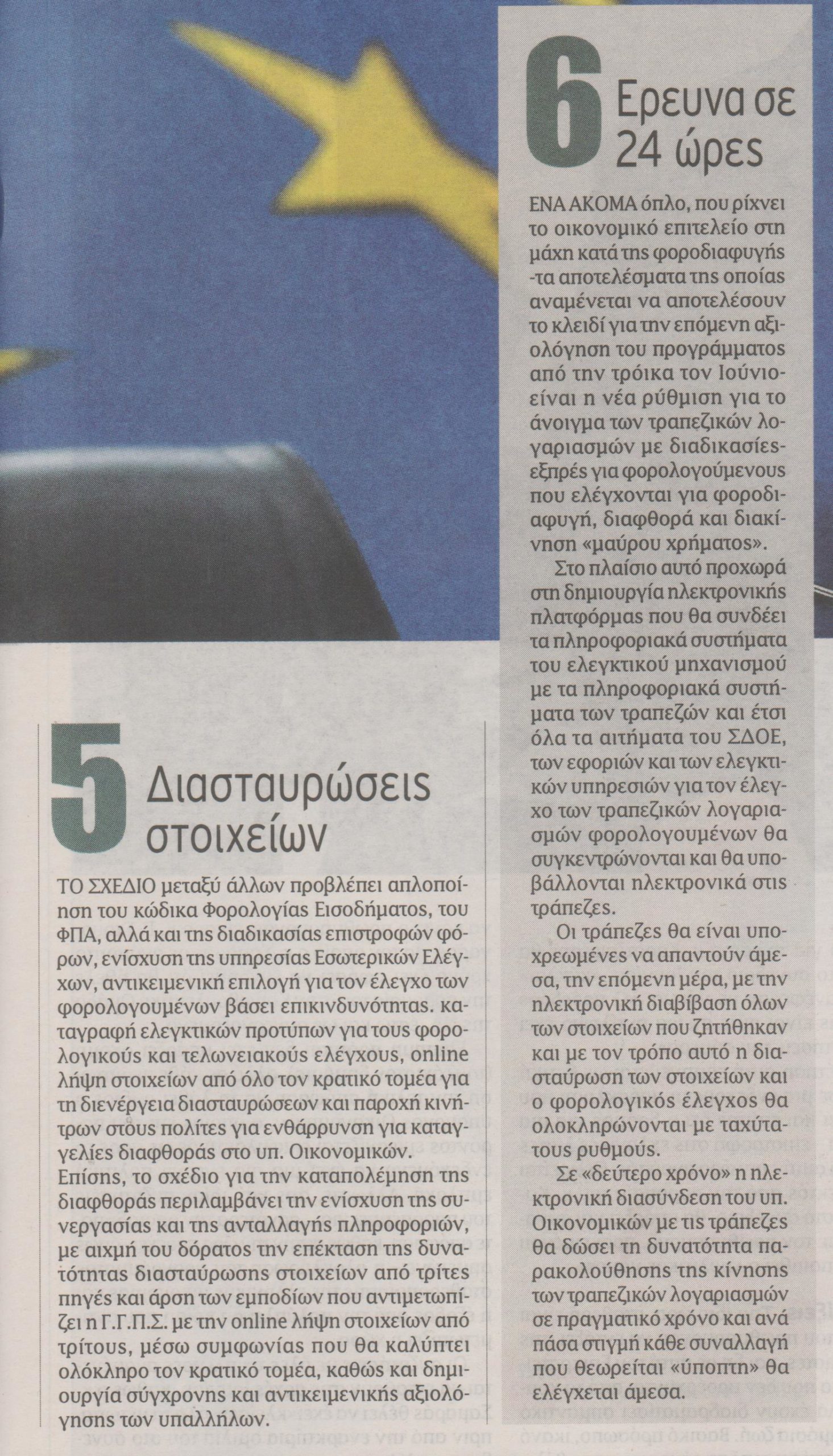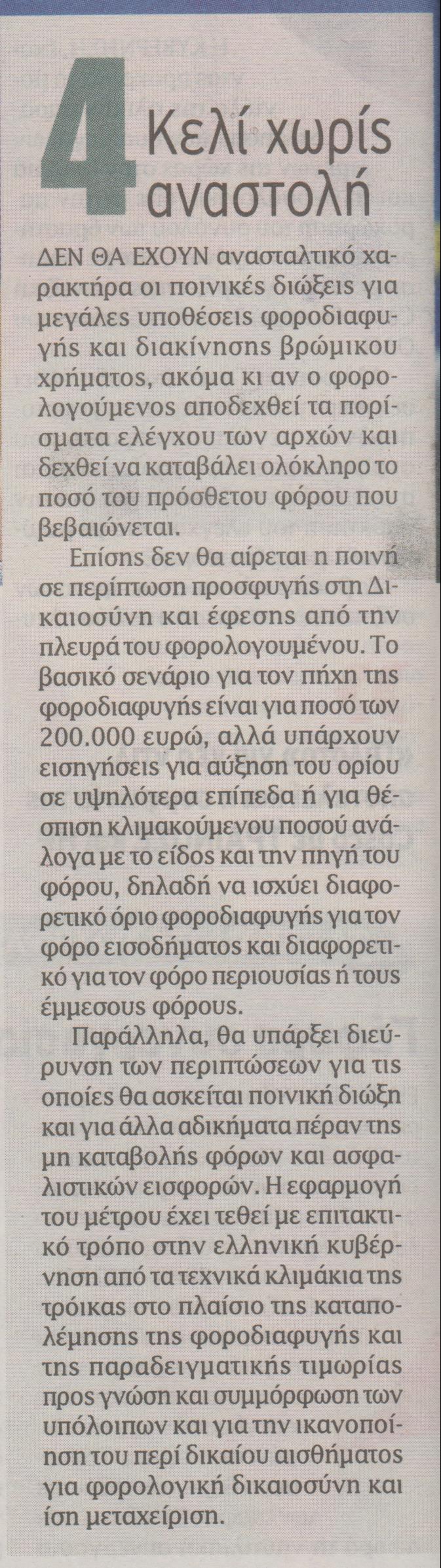 Τέλος, με τις προωθούμενες αλλαγές στο υφιστάμενο καθεστώς των κυρώσεων για φοροδιαφυγή επεκτείνονται σε όλο το φάσμα των φόρων η κατάργηση της δυνατότητας διοικητικού συμβιβασμού με την Εφορία με μείωση των προστίμων, η τμηματική καταβολή του φόρου, ενώ γίνεται άμεσα απαιτητό ολόκληρο το ποσό του πρόσθετου φόρου που καταλογίζεται στον υπόχρεο από τις ελεγκτικές αρχές.