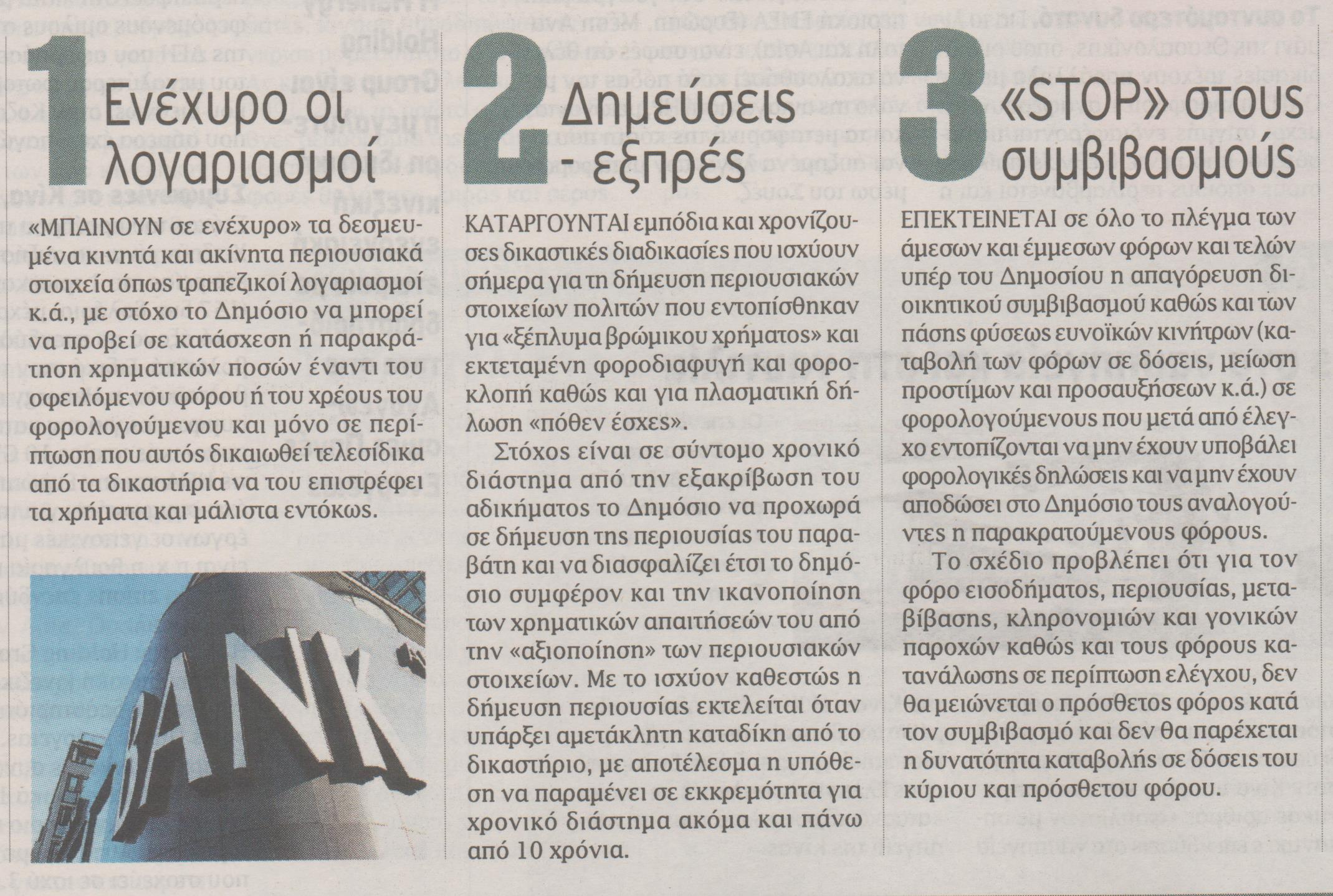 Το δεύτερο μέτρο προβλέπει την επιτάχυνση των διαδικασιών και την άρση των νομικών εμποδίων για δημεύσεις-εξπρές κινητών και ακίνητων περιουσιακών στοιχείων φορολογουμένων που εντοπίζονται από τις ελεγκτικές αρχές να έχουν διαπράξει οικονομικά εγκλήματα, όπως απόκρυψη μεγάλων εισοδημάτων, κατάχρηση δημόσιου χρήματος, υποβολή ψευδών και εικονικών δηλώσεων “πόθεν έσχες” και φοροκλοπή που προκαλεί μεγάλη οικονομική ζημιά στο Δημόσιο.