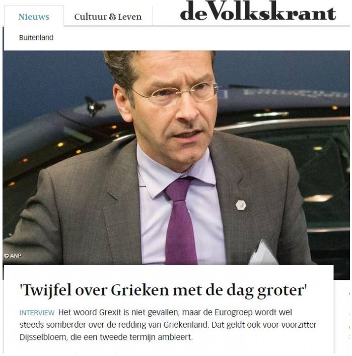 O πρόεδρος του Eurogroup, Γερούν Ντάισελμπλουμ, δήλωσε πως δεν βλέπει τρίτο μεγάλο πρόγραμμα «βοήθειας» για την Ελλάδα, σε συνέντευξη στην ολλανδική εφημερίδα Volkskrant.