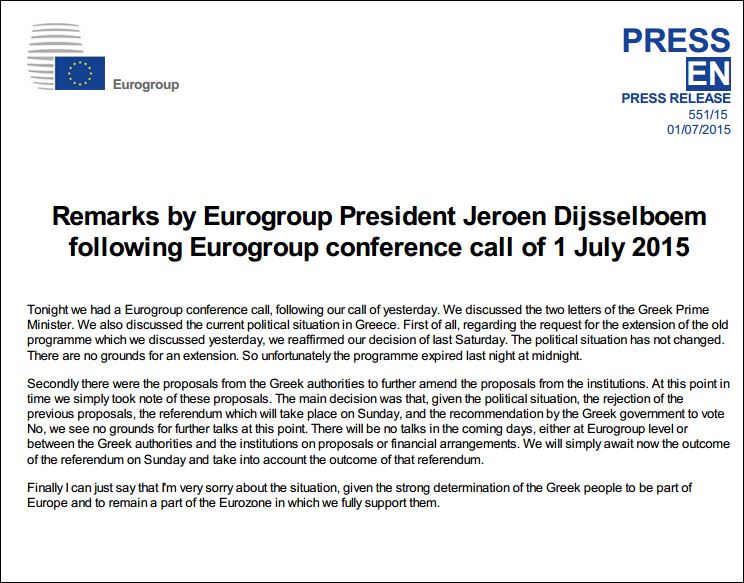 Απόψε είχαμε μια τηλεδιάσκεψη του Eurogroup, σε συνέχεια της χθεσινής. Συζητήσαμε τις δύο επιστολές του Έλληνα Πρωθυπουργού. Συζητήσαμε επίσης την τρέχουσα πολιτική κατάσταση στην Ελλάδα. Πρώτα απ ‘όλα, όσον αφορά το αίτημα για την παράταση του παλαιού προγράμματος που συζητήσαμε χθες, επιβεβαιώσαμε την απόφασή που λάβαμε το περασμένο Σάββατο. Η πολιτική κατάσταση δεν έχει αλλάξει. Δεν υφίστανται λόγοι για παράταση. Έτσι, δυστυχώς, το πρόγραμμα έληξε χθες το βράδυ, τα μεσάνυχτα.