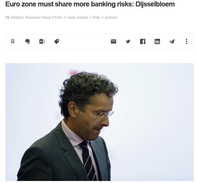 Παράλληλα, απέφυγε να πάρει ξεκάθαρη θέση για την κόντρα που έχει ξεσπάσει από την κάθετη άρνηση της Γερμανίας, αρκούμενος να σημειώσει ότι ο β. Σόιμπλε τόνισε ότι πρέπει να μειώσουμε τα ρίσκα στο τραπεζικό σύστημα, αλλά από την άλλη πλευρά πρέπει να στήσουμε και ένα σύστημα μεγαλύτερου διαμερισμού του ρίσκου. «Πρέπει να δούμε και τις δυο πλευρές», τόνισε.
