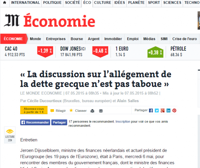 Aνοιχτό είναι το θέμα της ελάφρυνσης του ελληνικού χρέους αναφέρει σε συνέντευξη του στη γαλλική εφημερίδα Le Monde, ο επικεφαλής του Eurogroup Γερούν Ντάισελμπλουμ υπογραμμίζοντας πως «το θέμα της ανακούφισης του ελληνικού χρέους δεν είναι ταμπού».