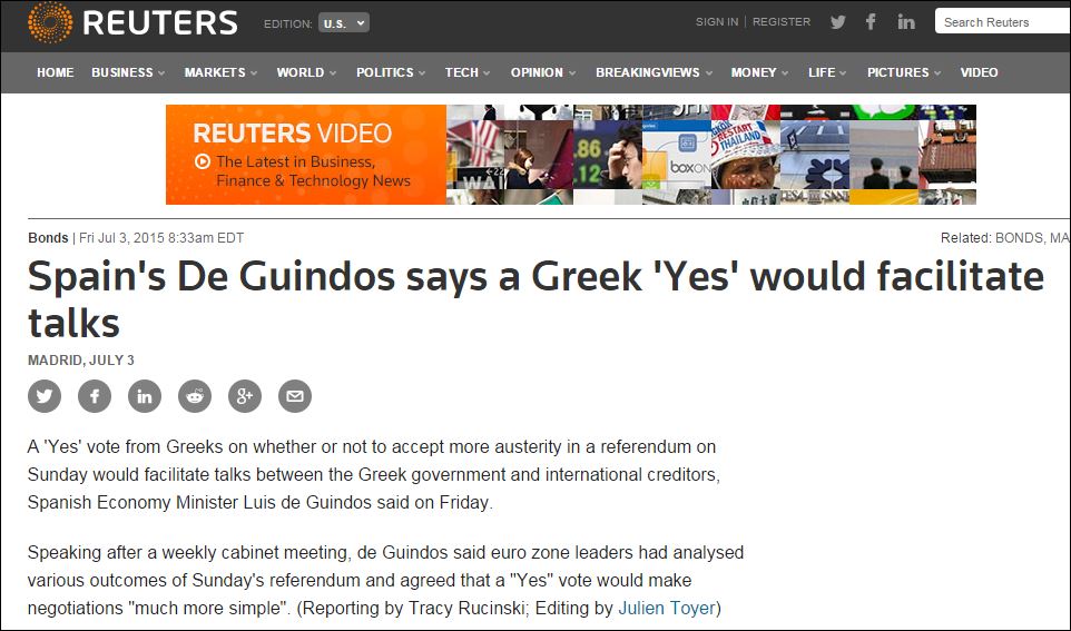 «Ένα “ναι” από τους Έλληνες στο δημοψήφισμα της Κυριακής θα διευκολύνει τις συνομιλίες μεταξύ της ελληνικής κυβέρνησης και των διεθνών πιστωτών», ανέφερε ο Ισπανός υπουργός Οικονομικών, Λουίς Ντε Γκίντος, σύμφωνα με το Reuters.