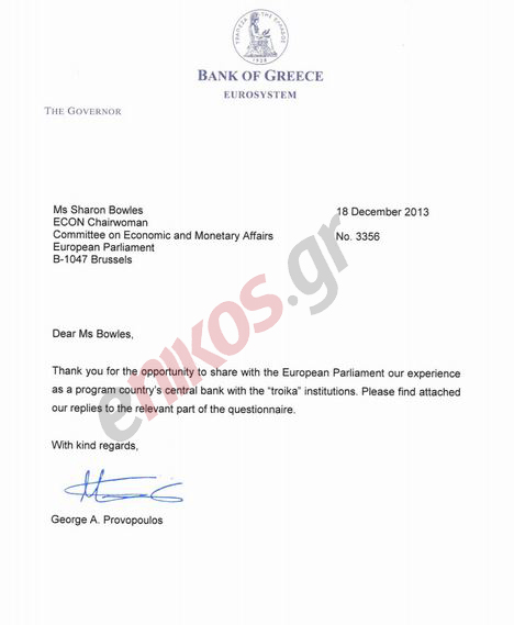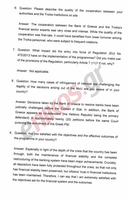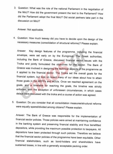 Στο συγκεκριμένο ερωτηματολόγιο της εξεταστικής επιτροπής έχει απαντήσει ο διοικητής της Τράπεζας της Ελλάδος Γ. Προβόπουλος, ο οποίος αναφέρεται στην πολύ καλή συνεργασία με την τρόικα και εξηγεί πως αποφασίστηκε να μπει η χώρα μας στο πρόγραμμα δανεισμού.