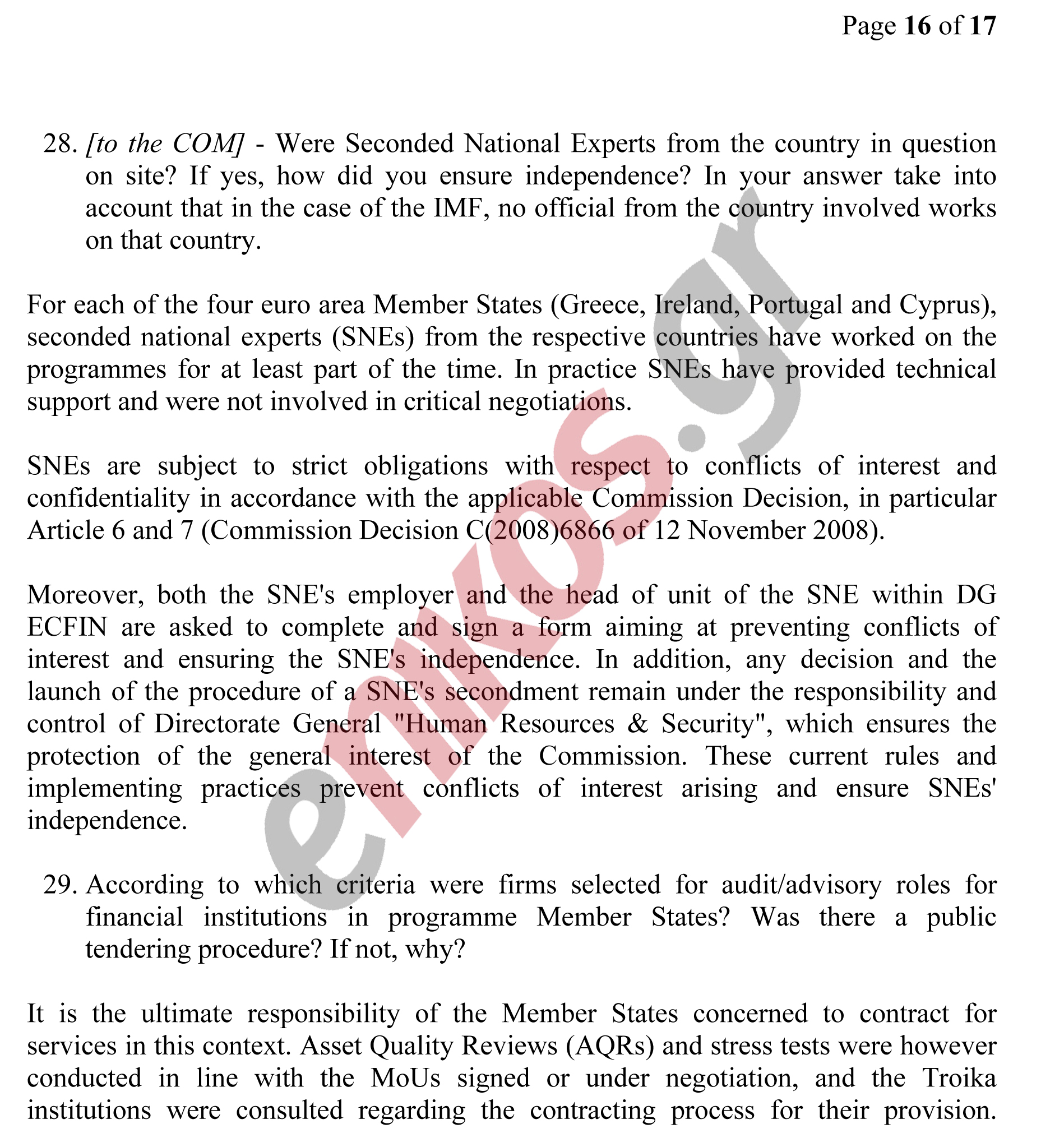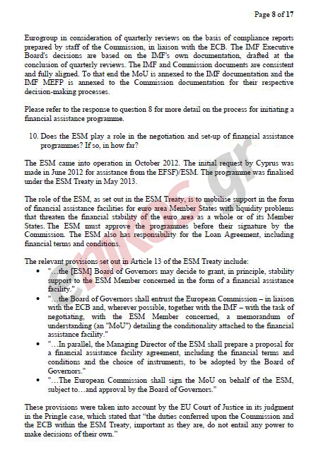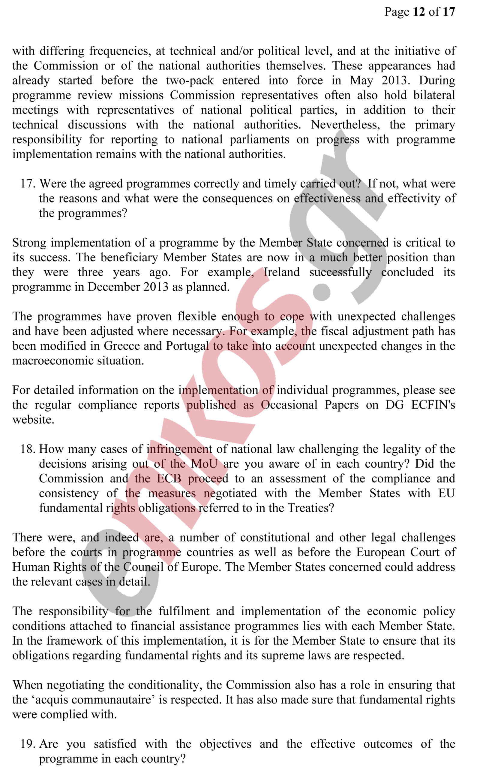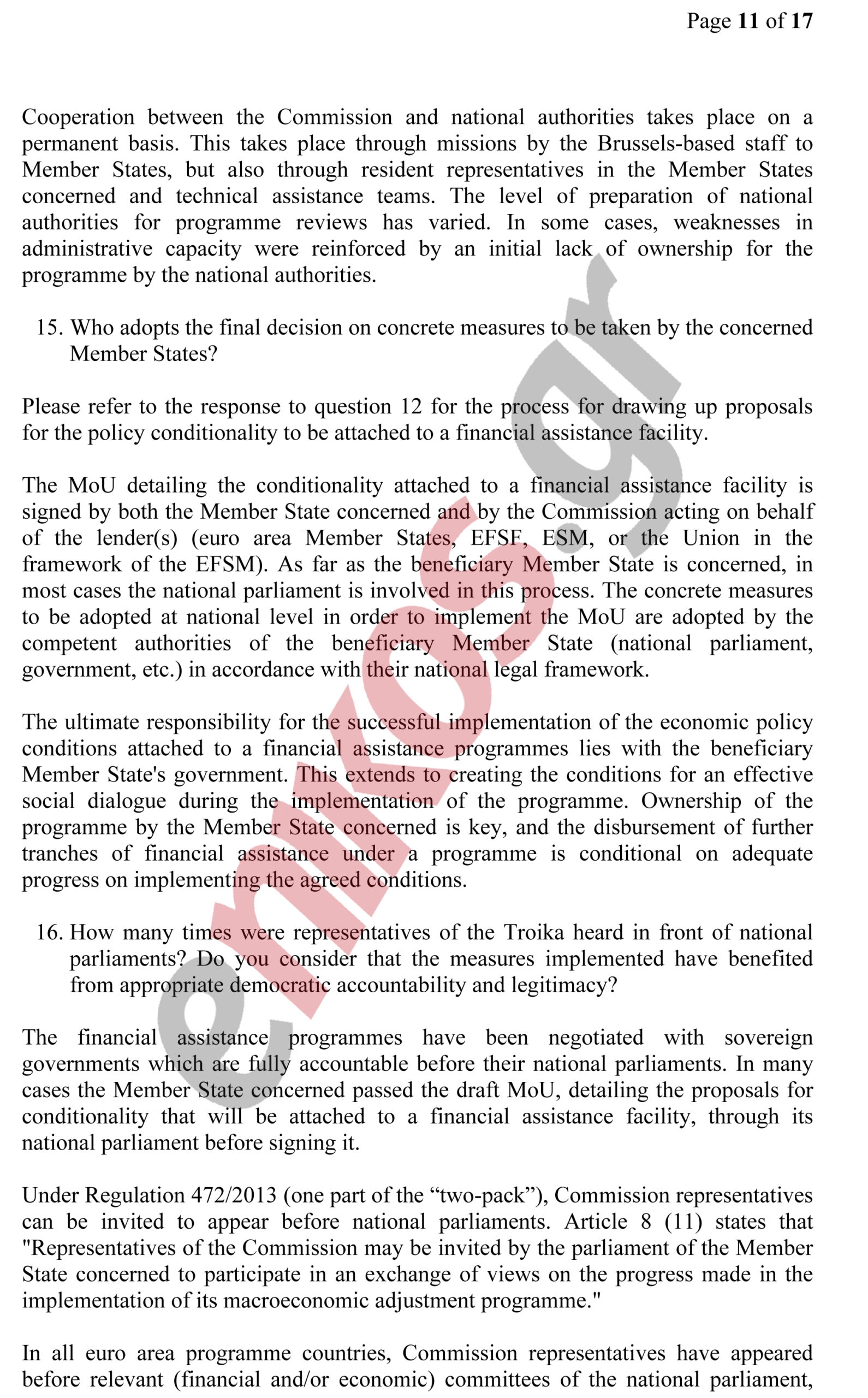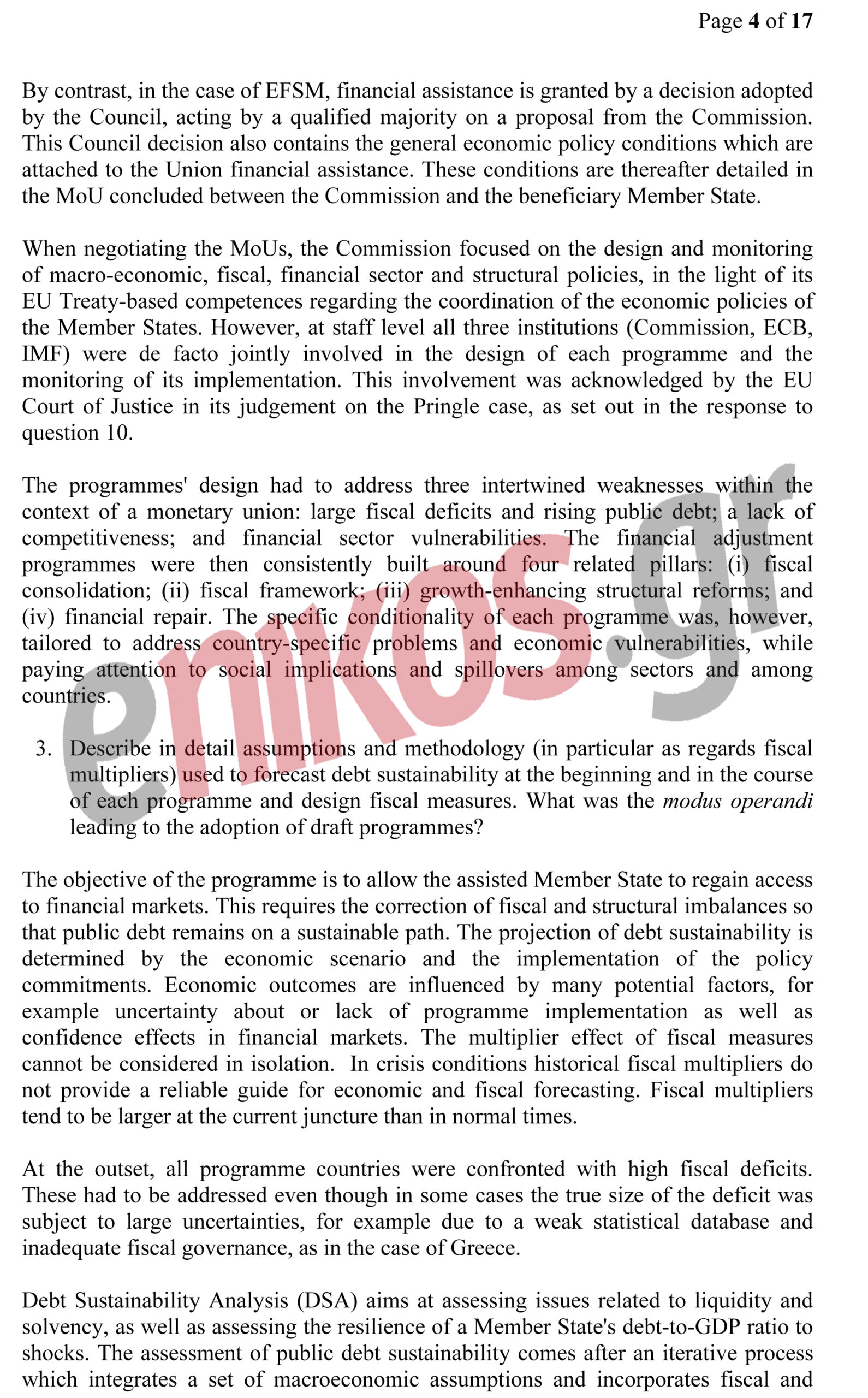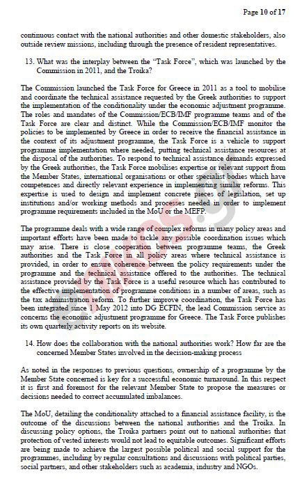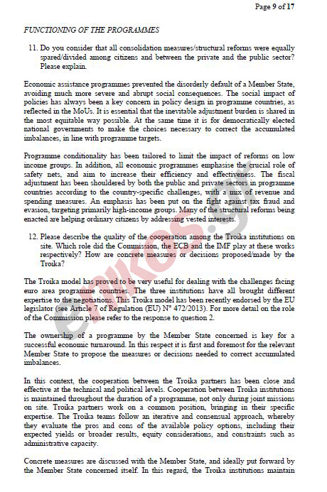 Στη σελίδα 14 της απάντησης της Κομισιόν γίνεται ξανά αναφορά στην Ελλάδα, καθώς επισημαίνεται: «Εκτός από εξωτερικούς παράγοντες, τα εσωτερικά πολιτικά προβλήματα ήταν υπεύθυνα για την καθυστέρηση στην εφαρμογή του πρώτου ελληνικού προγράμματος διάσωσης, που ώθησε στην ανάγκη για δεύτερο μνημόνιο».