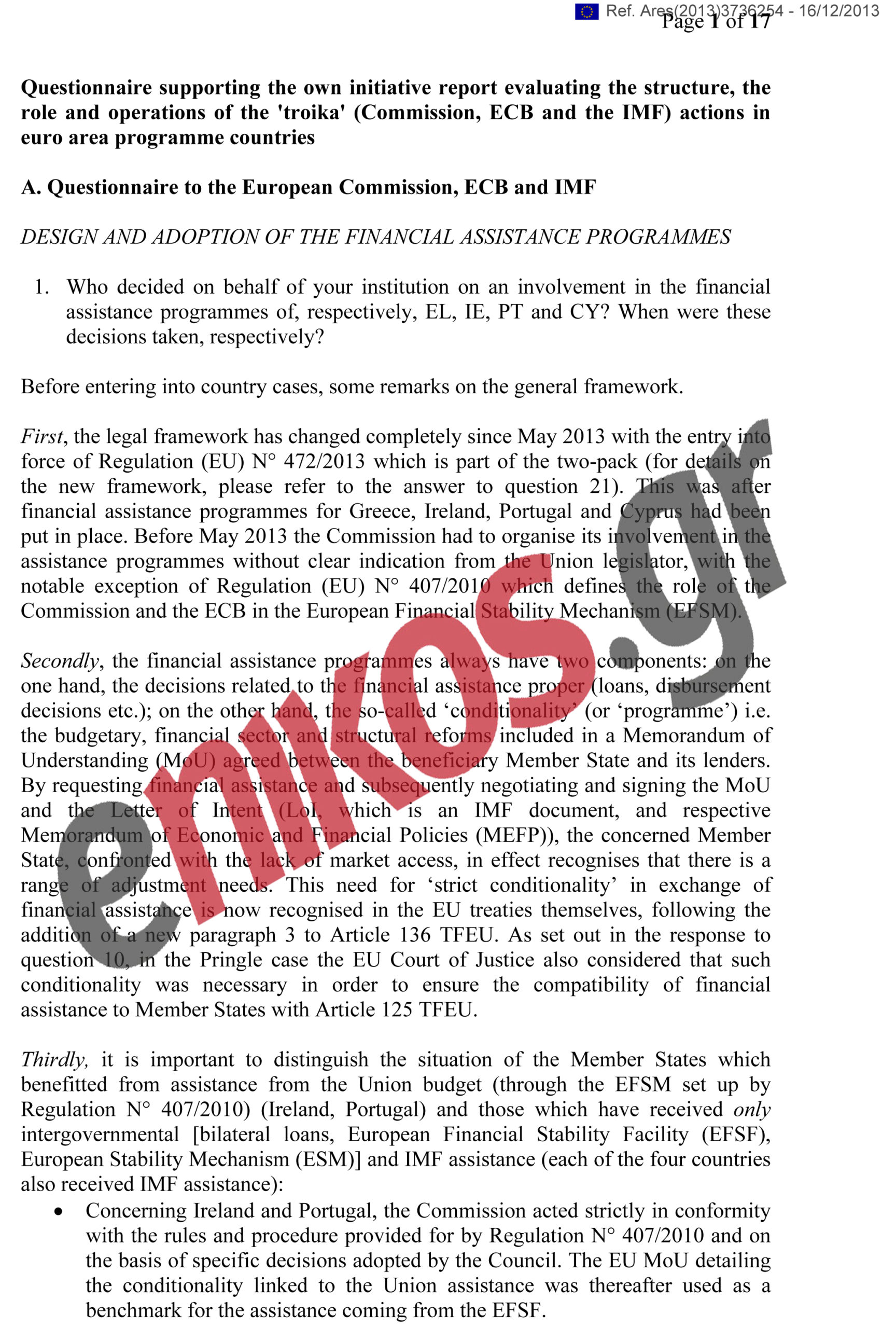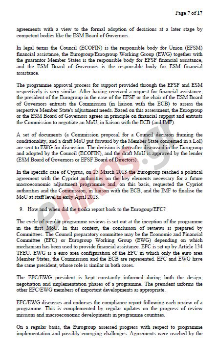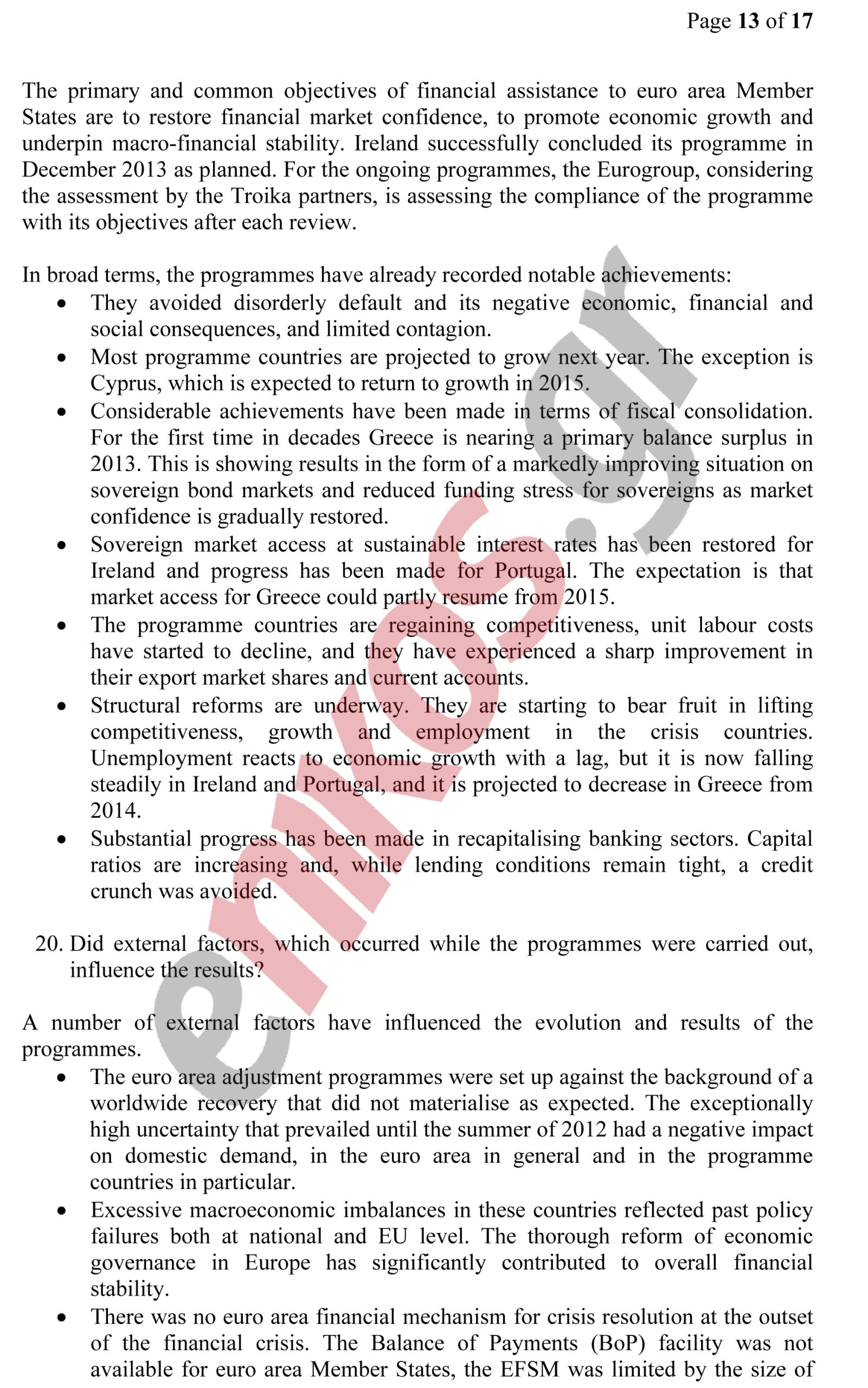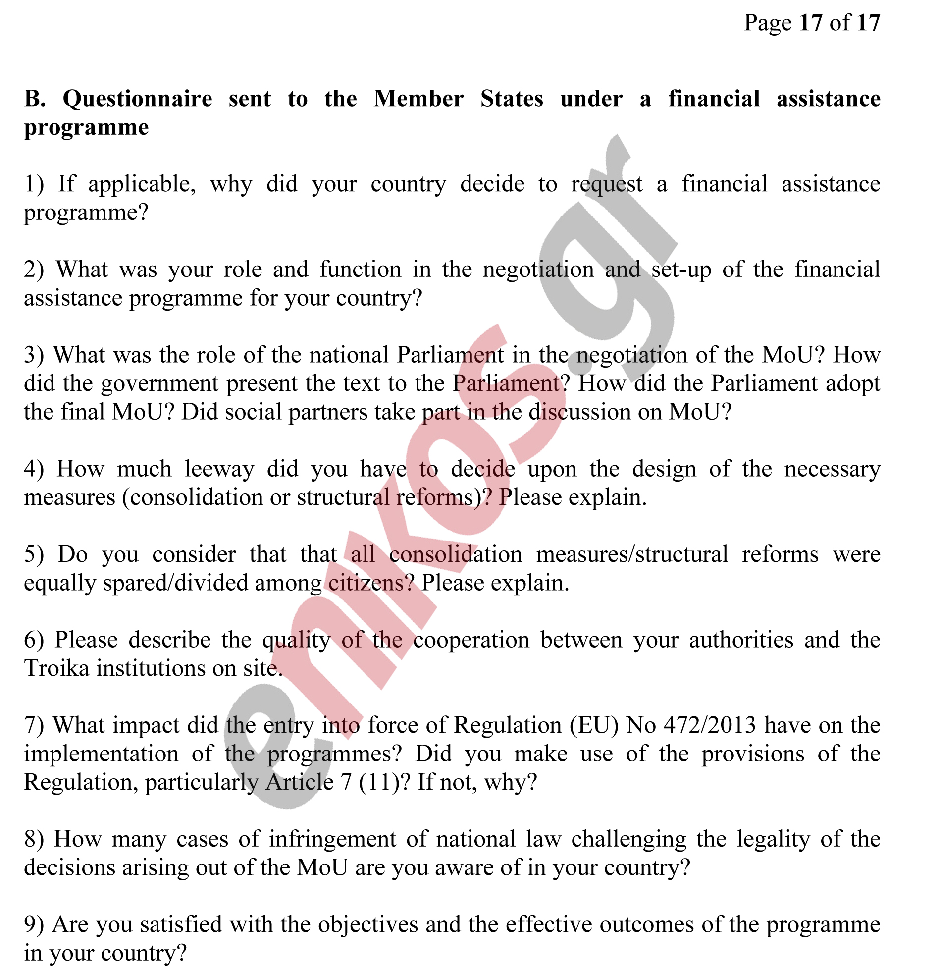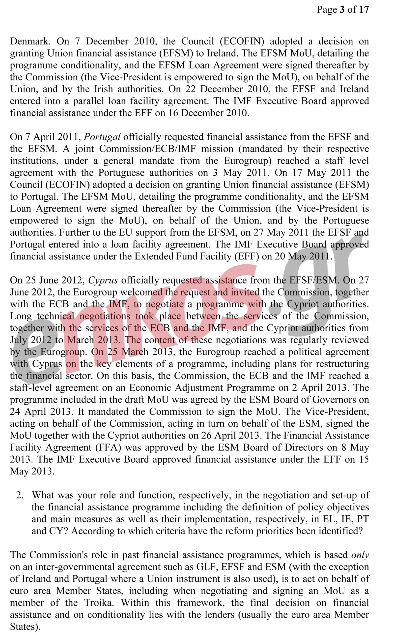 Στη σελίδα 14 της απάντησης της Κομισιόν γίνεται ξανά αναφορά στην Ελλάδα, καθώς επισημαίνεται: «Εκτός από εξωτερικούς παράγοντες, τα εσωτερικά πολιτικά προβλήματα ήταν υπεύθυνα για την καθυστέρηση στην εφαρμογή του πρώτου ελληνικού προγράμματος διάσωσης, που ώθησε στην ανάγκη για δεύτερο μνημόνιο».