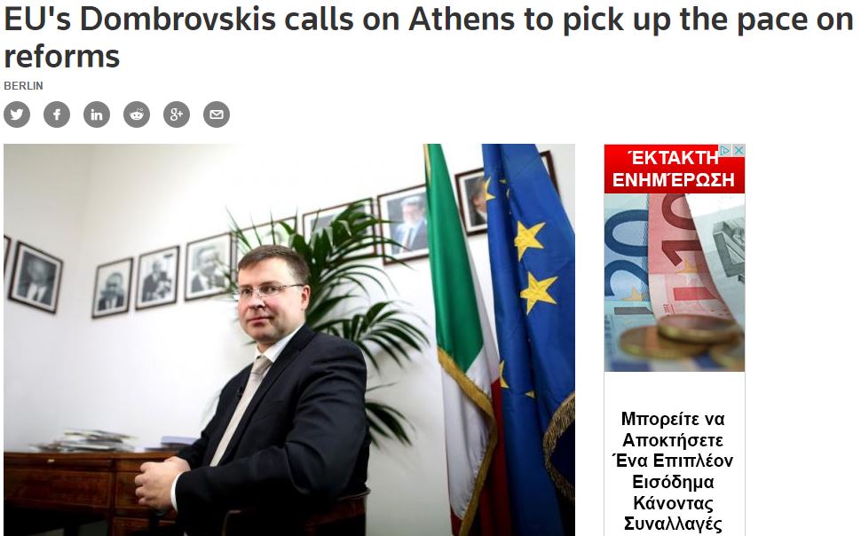 Επιτάχυνση της μεταρρυθμιστικής προσπάθειας ζητά από την Αθήνα ο αντιπρόεδρος της Κομισιόν, Βάλντις Ντομπρόβσκις, ως βασικό προαπαιτούμενο ώστε να δοθεί περαιτέρω χρηματοδότηση.