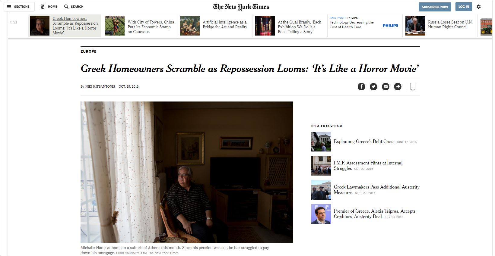 «Από τη στιγμή που υπέγραψε το τρίτο πακέτο διάσωσης, το καλοκαίρι του 2015, ο πρωθυπουργός Αλέξης Τσίπρας έχει λιγότερο μέσο πίεσης απέναντι στους δανειστές. Οι επικριτές λένε ότι κάνει τη μία υποχώρηση μετά την άλλη, παρά τις υποσχέσεις να προστατεύσει τα σπίτια. Κυβερνητικοί αξιωματούχοι επέμεναν ότι είναι ασφαλή. Ο υπουργός Οικονομίας Γιώργος Σταθάκης σε δήλωση ανέφερε ότι οι πρώτες κατοικίες ήδη προστατεύονται σε ό,τι αφορά τα χρέη προς τράπεζες. Οι αρχές, πρόσθεσε, εξετάζουν περαιτέρω παρέμβαση για χρέη αποκλειστικά προς το Δημόσιο. Όμως, την άνοιξη η κυβέρνησε ήρε την απαγόρευση πώλησης των στεγαστικών και των δανείων προς μικρές επιχειρήσεις. Το καλοκαίρι πέρασαν νέοι νόμοι που επέτρεψαν στις τράπεζες να ξεκινήσουν κατασχέσεις αν οι οφειλέτες θεωρούν μη συνεργάσιμοι», αναφέρουν οι New York Times.