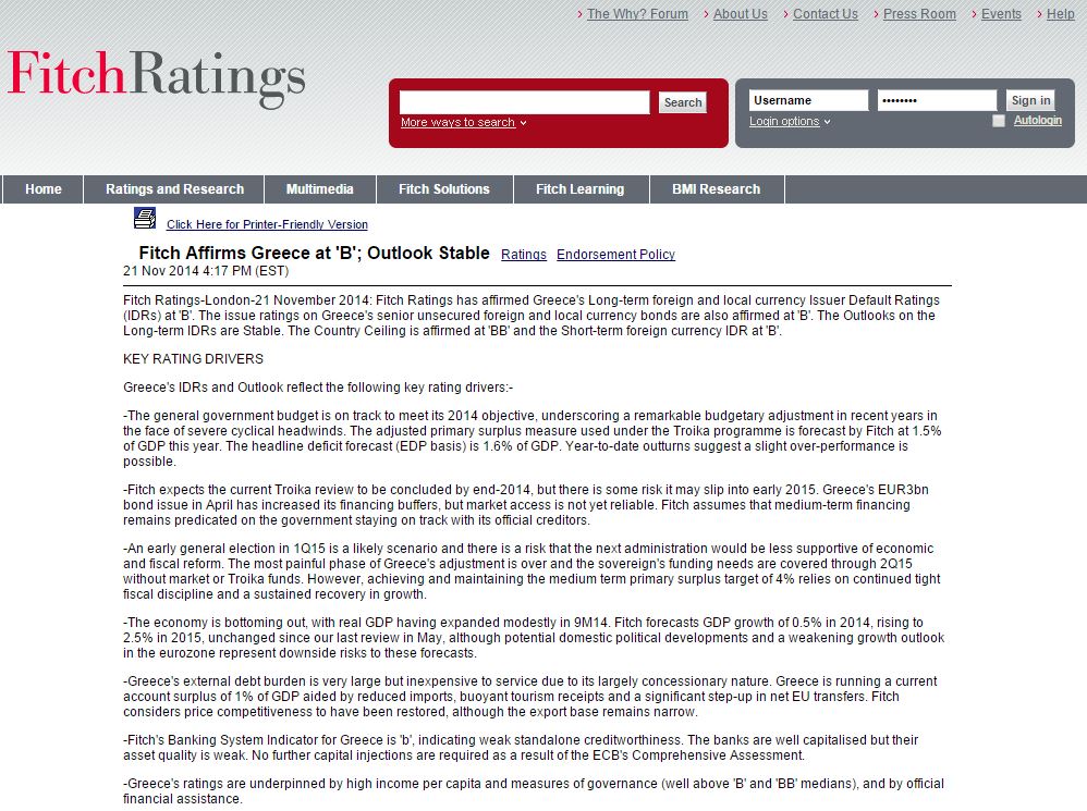 Σύμφωνα με το euro2day.rg, στις 23 Μαίου 2014 η Fitch είχε αναβαθμίσει την Ελλάδα σε «Β» από «Β-», με σταθερό “outlook”.