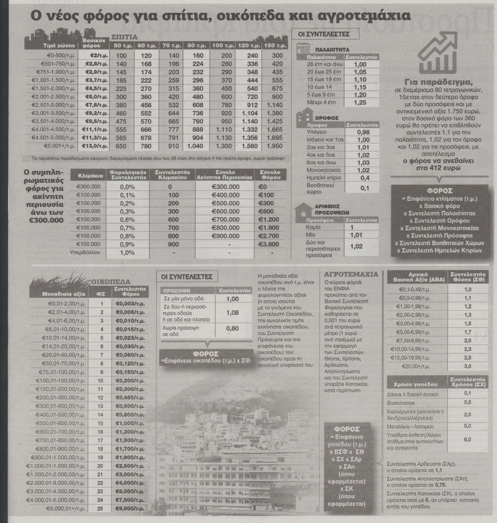 Ο φόρος για σπίτια, οικόπεδα, αγροτεμάχια-Πίνακες, παραδείγματα
