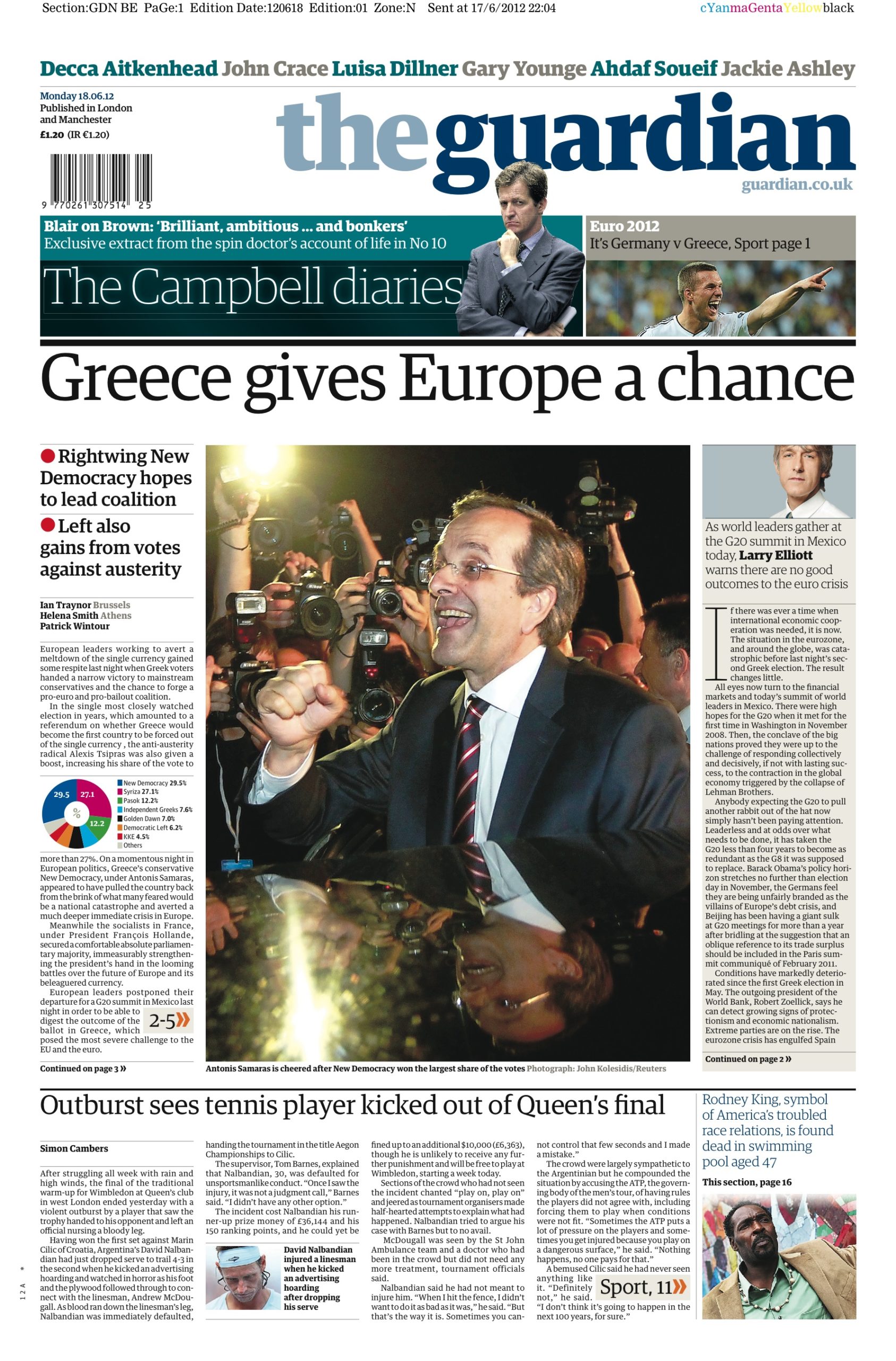 Το πρώτο θέμα του Guardian δίνει τα παράσημα στην Ελλάδα μετά τα αποτελέσματα των εκλογών. Το σημερινό εξώφυλλο της εφημερίδας φέρει τον τίτλο “Η Ελλάδα δίνει μια ευκαιρία στην Ευρώπη”…
