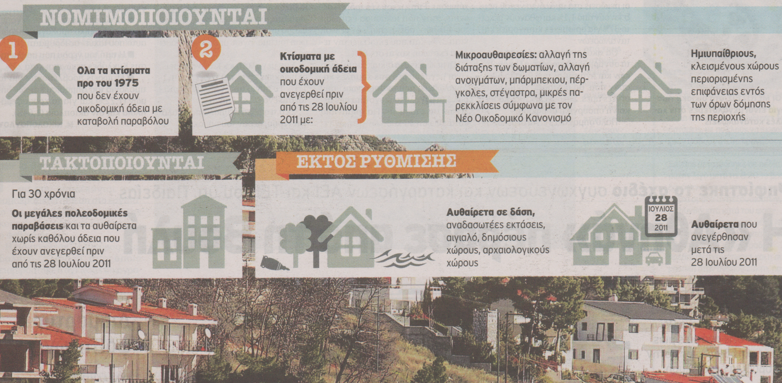 Με το ίδιο νομοθέτημα, νομιμοποιούνται όλες οι μικροαυθαιρεσίες ενός ακινήτου που διαθέτει οικοδομική άδεια. Σύμφωνα με ασφαλείς πληροφορίες, η δυνατότητα νομιμοποίησης των μικρών αυτών πολεοδομικών παραβάσεων θα ισχύει εσαεί.