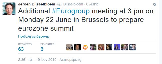 “Νέο Eurogroup θα γίνει τη Δευτέρα 22 Ιουνίου στις 2 μμ, ώρα Ελλάδος, για να προετοιμάσει την έκτακτη σύνοδο κορυφής της ευρωζώνης”, ενημερώνει με ένα tweet o πρόεδρος του Eurogroup, Γερούν Ντάισελμπλουμ.