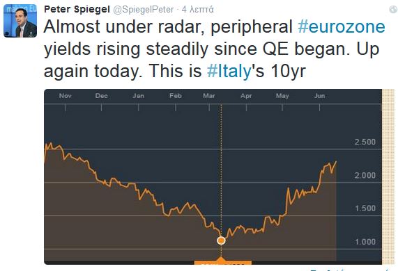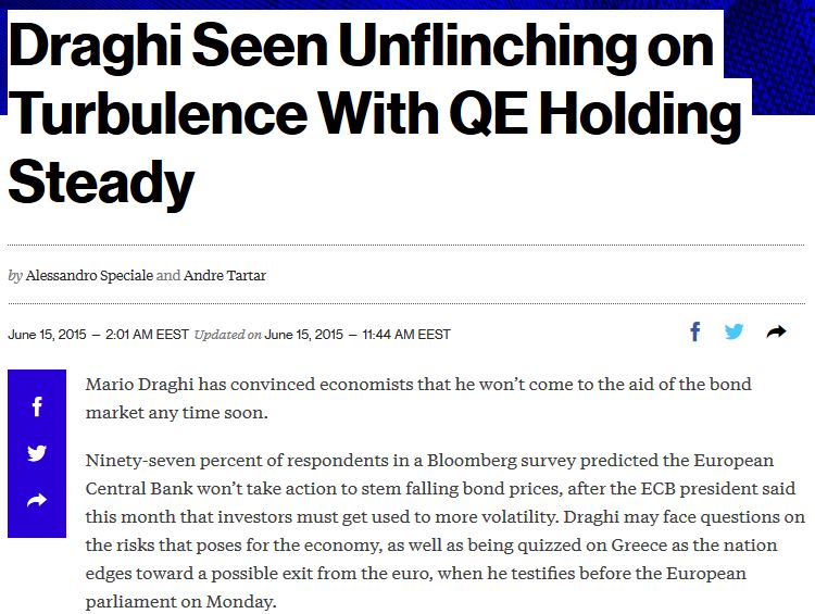 Ο Πρόεδρος της Ευρωπαϊκής Κεντρικής Τράπεζας (ΕΚΤ) Μάριο Ντράγκι αναμένεται να ερωτηθεί σήμερα από ευρωβουλευτές για την Ελλάδα στην ακρόασή του από το Ευρωπαϊκό Κοινοβούλιο, μεταδίδει το πρακτορείο Bloomberg. Ο Ντράγκι αναμένεται να ερωτηθεί και για τους κινδύνους που τίθενται για την οικονομία της Ευρωζώνης από την πτώση των τιμών (και την αύξηση των αποδόσεων) των ομολόγων της Ευρωζώνης.