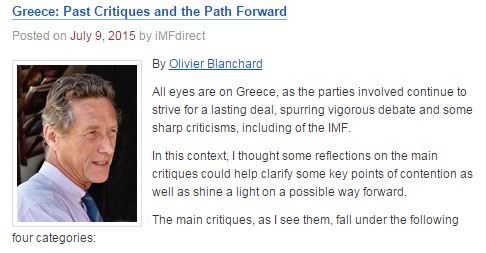 Απαντήσεις στην κριτική που δέχεται ο ίδιος, το Ταμείο κι η τρόικα για τις αποτυχίες του ελληνικού προγράμματος στήριξης, επιχειρεί να δώσει ο επικεφαλής των οικονομολόγων του ΔΝΤ, Ολιβιέ Μπλανσάρ, με άρθρο που ανάρτησε στο blog του «Ταμείου».