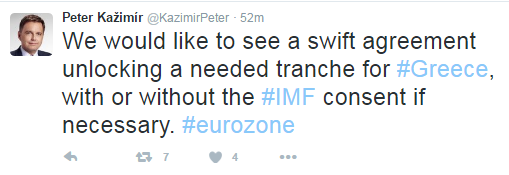 Επιθυμούμε μία γρήγορη συμφωνία για το κλείσιμο της αξιολόγησης του ελληνικού προγράμματος με ή χωρίς τη συγκατάθεση του ΔΝΤ, έγραψε ο Σλοβάκος υπουργός Οικονομικών, Πέτερ Καζιμίρ στο Twitter.