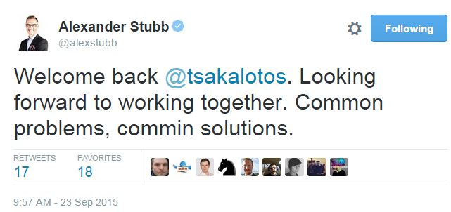 «Κοινά προβλήματα, κοινές λύσεις» αναφέρει ο Αλεξάντερ Στουμπ στο twitter για την επιστροφή Τσακαλώτου στο υπουργείο Οικονομικών.