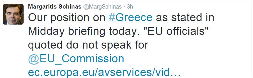 «Η θέση μας για την Ελλάδα διατυπώθηκε στο σημερινό Briefing. Οι κοινοτικοί αξιωματούχοι που αναφέρονται σε δημοσιεύματα δεν μιλούν για λογαριασμό της Επιτροπής» έγραψε ο Μαργαρίτης Σχοινάς στο twitter.