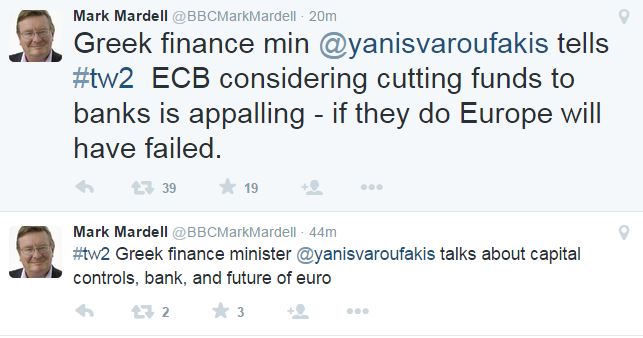 Όπως ο ίδιος ο συντάκτης ενημέρωσε στον προσωπικό του λογαριασμό στο twitter, ο υπουργός Οικονομικών, έκανε λόγο για capital controls αλλά και το ενδεχόμενο να μείνουν κλειστές οι τράπεζες τη Δευτέρα.