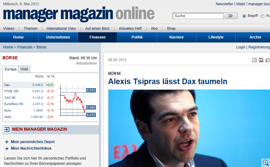 “Ο Αλέξης Τσίπρας ‘τρέλανε’ τον δείκτη υψηλής κεφαλαιοποίησης της Γερμανίας -Dax” είναι ο τίτλος δημοσιεύματος του γερμανικού οικονομικού περιοδικού, Manager Magazin που αναφέρεται στην αποσταθεροποίηση του χρηματιστηρίου της Φρανκφούρτης. “Ο φόβος του πολιτικού χάους στην Ελλάδα τρέπει τους επενδυτές σε φυγή. Ο δείκτης Dax έπεσε κάτω από το όριο των 6.500 μονάδων. Ακόμα και στη Wall Street συνεχίζονται οι απώλειες για τον Dow Jones. Αιτία όλων αυτών βέβαια, είναι οι δηλώσεις του ηγέτη της αριστερής παράταξης (ΣΥΡΙΖΑ) στην Ελλάδα, Αλέξη Τσίπρα, σύμφωνα με τις οποίες δεν είναι διατεθειμένος να εφαρμόσει το πρόγραμμα λιτότητας” γράφει το περιοδικό. “Το χάος στην Ελλάδα οδηγεί τις χρηματιστηριακές αγορές του κόσμου για ακόμη μια φορά σε αποσταθεροποίηση.” σημειώνει το περιοδικό.