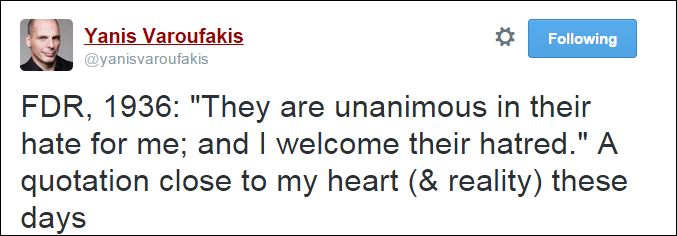 Με μία φράση του Ρούσβελτ απάντησε πριν από λίγο μέσα από το twitter ο Γιάνης Βαρουφάκης στις επικρίσεις που δέχθηκε μετά το Eurogroup αλλά και στο δημοσίευμα του Reuters το οποίο ανέφερε ότι δεν παρέστη στο δείπνο των υπουργών Οικονομικών της Ευρωζώνης.