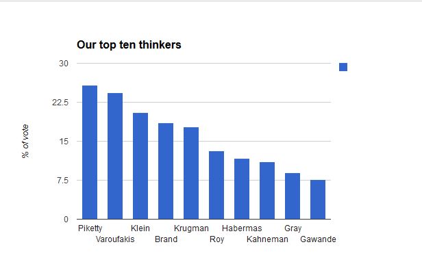 Την πρώτη θέση κατέκτησε ο Γάλλος οικονομολόγος Τόμας Πικετί, ο οποίος έγραψε το βιβλίο «Το Κεφάλαιο στον 21ο αιώνα» και έχει πουλήσει 1,5 εκατομμύριο αντίτυπα σε όλο τον κόσμο, ενώ έχει μεταφραστεί σε πολλές γλώσσες.