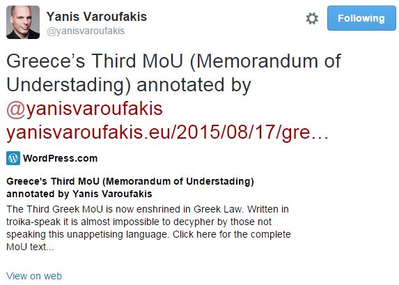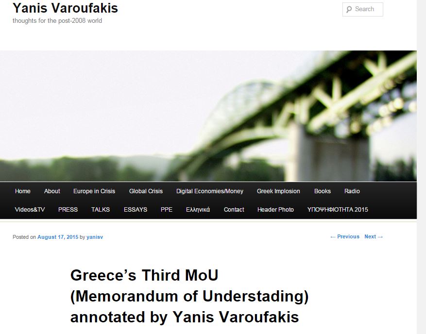 Όπως σημειώνει μέσα στο κείμενο που παραθέτει σε αρχείο “η αληθινή ιστορία είναι πως το μνημόνιο προετοιμάστηκε ώστε να αντανακλά την κεφαλαιοποίηση του εξευτελισμού της ελληνικής κυβέρνησης στη Σύνοδο Κορυφής της 12ης Ιουλίου”. Μεταξύ άλλων ο Γ. Βαρουφάκης εξηγεί πως το κείμενο επιβάλει στην Αθήνα να “συμφωνεί εκ των προτέρων με την τρόικα, ακόμη και αν διαφωνεί! Φυσικά το αντίθετο δεν υφίσταται”.