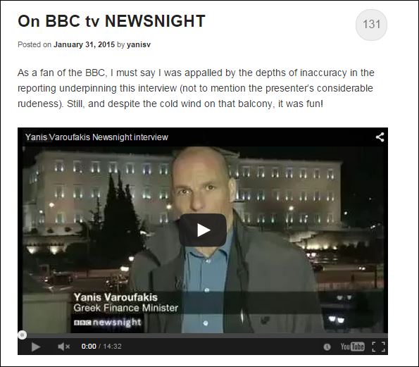 Διασκεδαστική παρά τον κρύο αέρα, χαρακτηρίζει ο Γιάνης Βαρουφάκης την επεισοδιακή συνέντευξη που παραχώρησε στην εκπομπή Newsnight του BBC.
