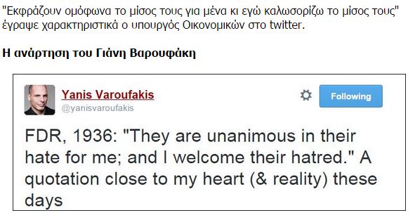 Ο Γ. Βαρουφάκης έγραφε στο tweet στις 26 Απριλίου τη φράση του Φ. Ρούσβελτ: